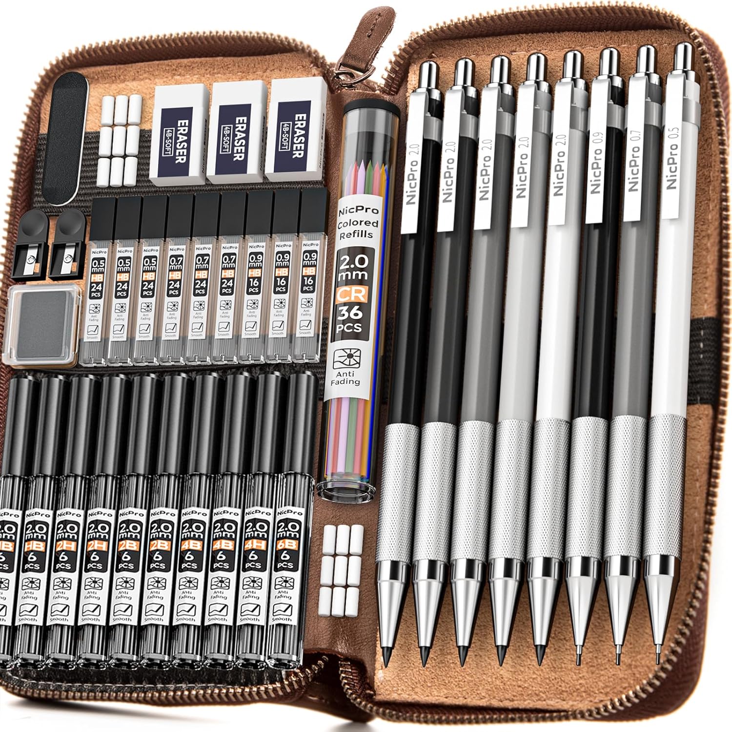 Nicpro 38PCS Art Mechanical Pencils Set in Leather Case, 3 PCS Metal Drafting Pencil 0.5, 0.7, 0.9 mm & 5 PCS 2mm Lead Holder (6B 4B 2B HB 2H 4H Colors) For Sketching Drawing With 20 Tube Lead Refills