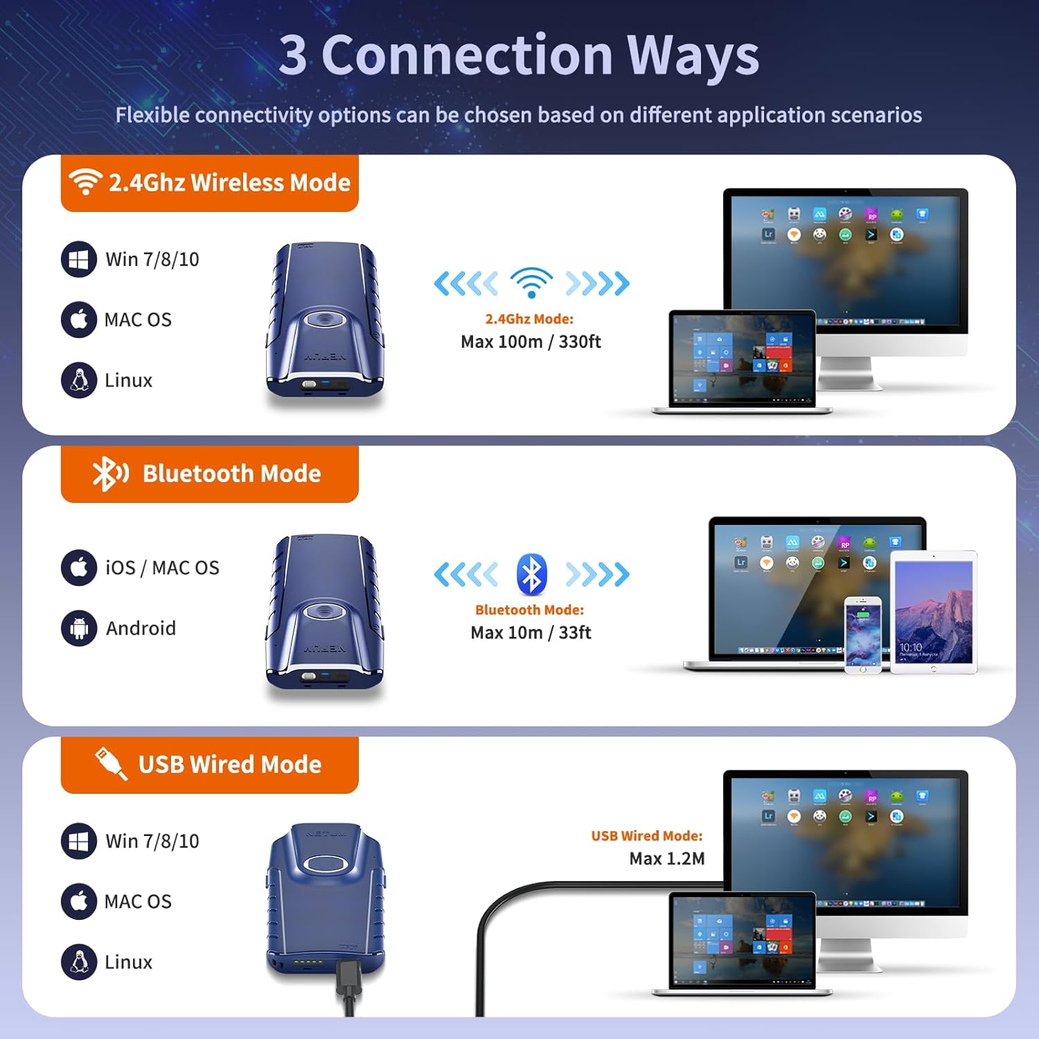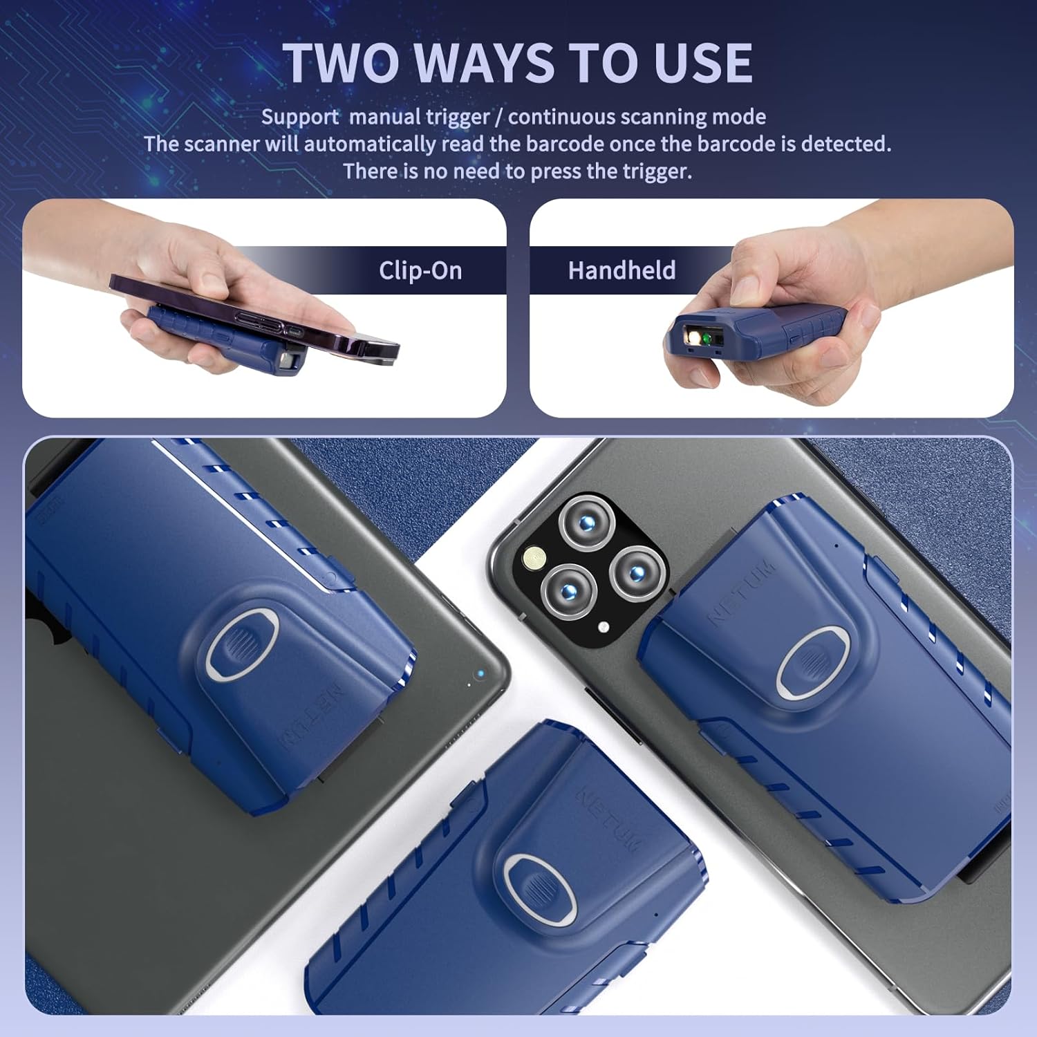- Two Ways to Use - The NETUM E950 is compact, efficient and cost-effective, You can use it as a back clip barcode scanner to fixed on the mobile phone, or you can use it alone as a normal Bluetooth barcode scanner.Manual trigger mode + Continus scanning mode,The scanner will automatically read the barcode once the barcode is detected. There is no need to press the trigger.