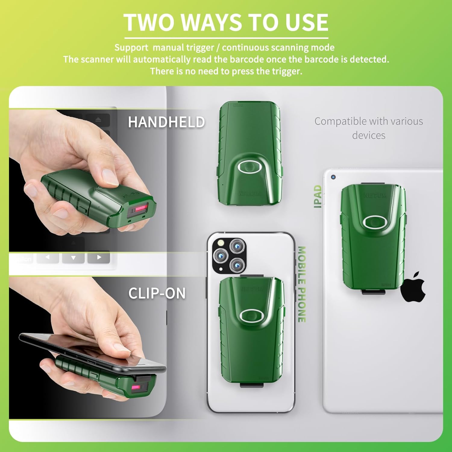 - Two Ways to Use - The NETUM E740 is compact, efficient and cost-effective, You can use it as a back clip barcode scanner to fixed on the mobile phone, or you can use it alone as a normal Bluetooth barcode scanner.Manual trigger mode + Continus scanning mode,The scanner will automatically read the barcode once the barcode is detected. There is no need to press the trigger.