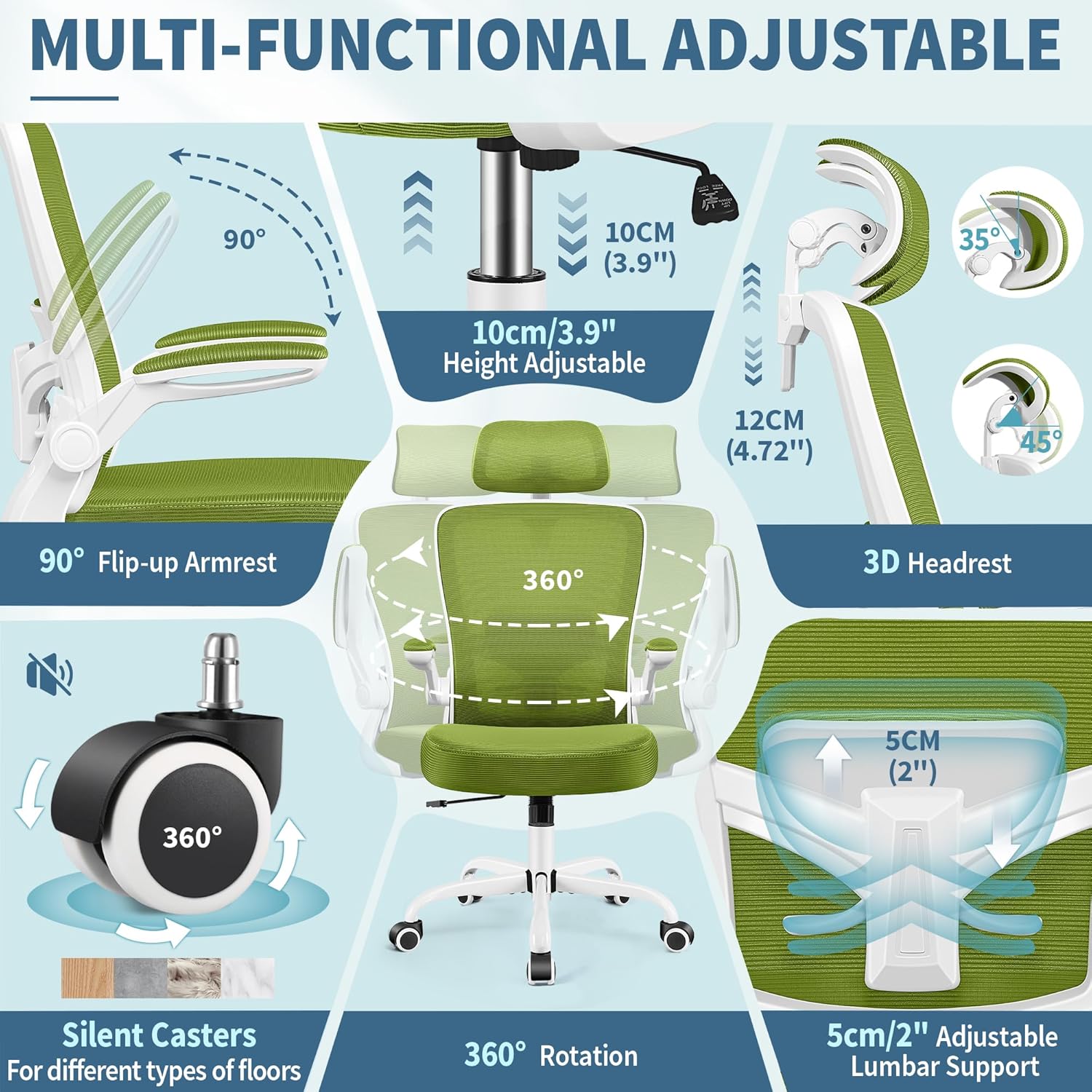 - Flexible Adjustable Functions:The rolling swivel computer chair is built with adjustable heigh: 10cm/3.9inch lift up and down, 5cm/2inch adjustable headrest(30° flip up) and backrest, 90-120° tilt adjustment, 90° flip-up handrail and 360° free rotation, supporting shoulder, back, waist and coccyx relaxation. Upgraded adjustable headrest and lumbar support, widened backrest and high-density armrests, which enhance ergonomically tailored comfort, to meet the needs of work and leisure time.