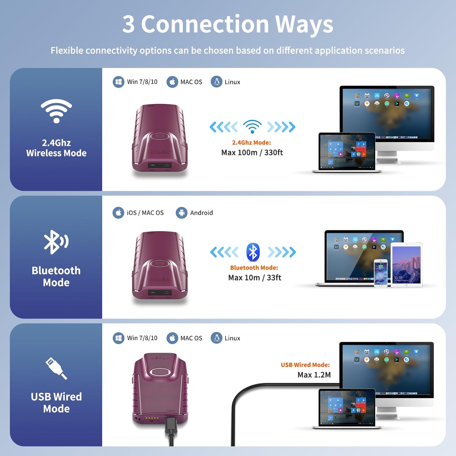- Wireless Bluetooth Technology - NETUM back clip barcode scanner Connects easily to a wide range of Bluetooth enabled smartphones, tablets, notebook and desktop computers, You can easily scan the barcode and check the data on your phone at the same time.Bluetooth HID, SPP, and BLE mode are all available. Work with Windows, Mac OS, Android, iOS.