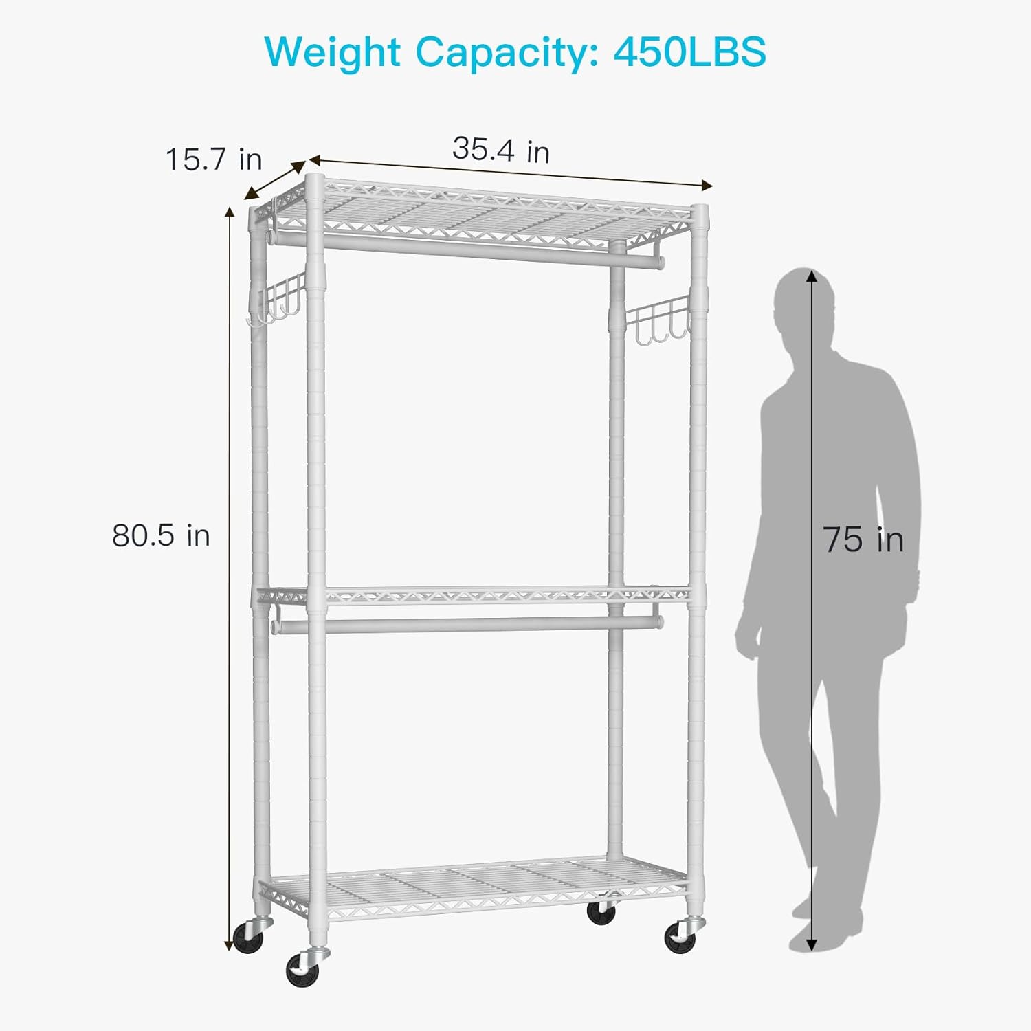 P1 Heavy Duty Garment Rack, 3 Tiers Adjustable Rolling Metal Closet Organizer with Lockable Wheels, FreeStanding Wardrobe with Double Hanger Rods & 1 Pair Hooks, Max Load 450 LBS, White