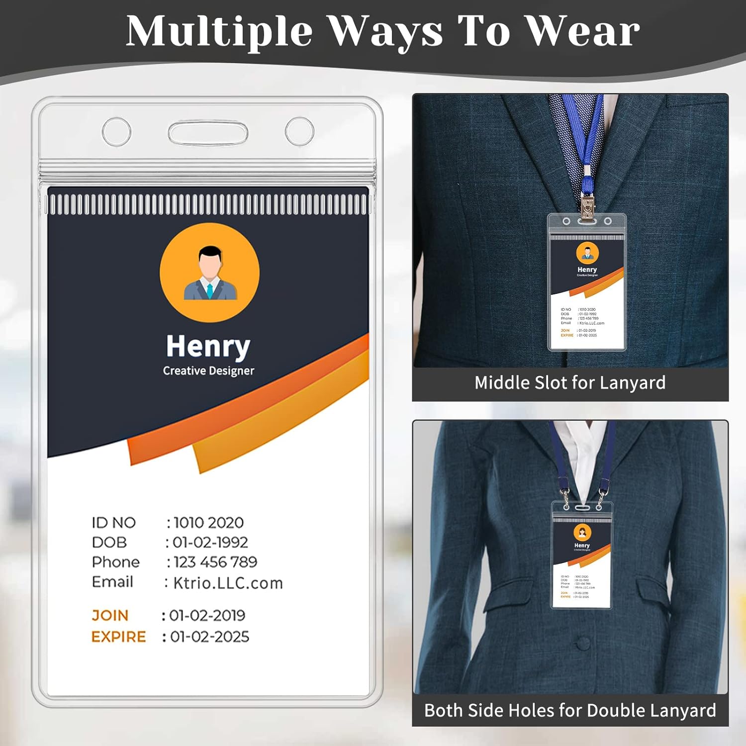 - Practical Design - Three holes on the ID badge holder are pre-punched, the middle slot is used for lanyards, key chains or retractable clips, and the holes on both sides are used for ropes. It is safe in place by other badge holder lanyards, clip onto belts, pant loops, bags, pockets, backpacks, purses, or anywhere you like.