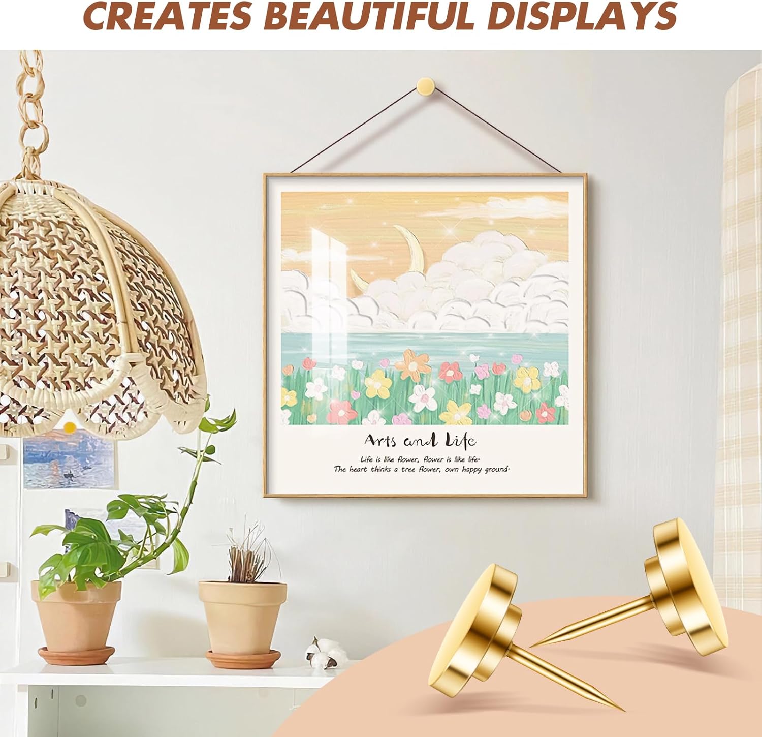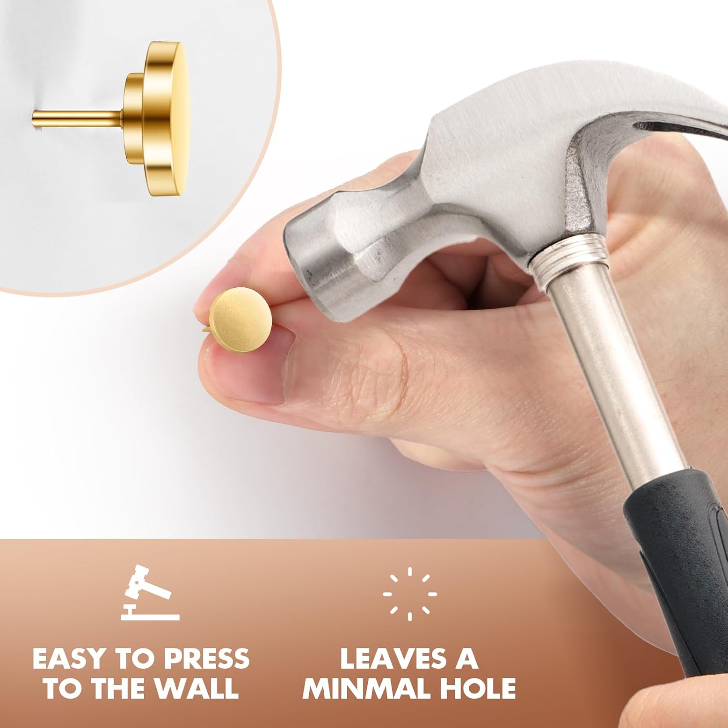 - 【Easy Installation】In the shape of ordinary push pins with gold color, these metal push pins are easy to install without causing damage to your walls. Simply tap them in with minimal effort using a picture hanging tool, and you're ready to showcase your favorite wall art or decorations, these metal push pins and picture hanging hooks are perfect for heavy-duty use.