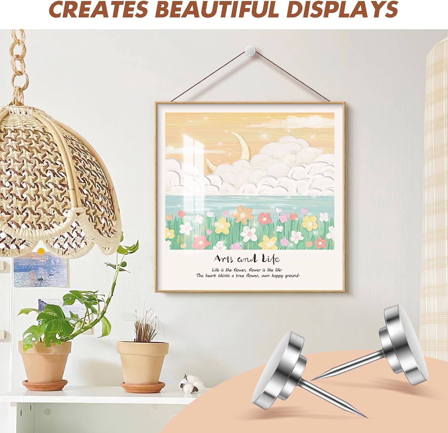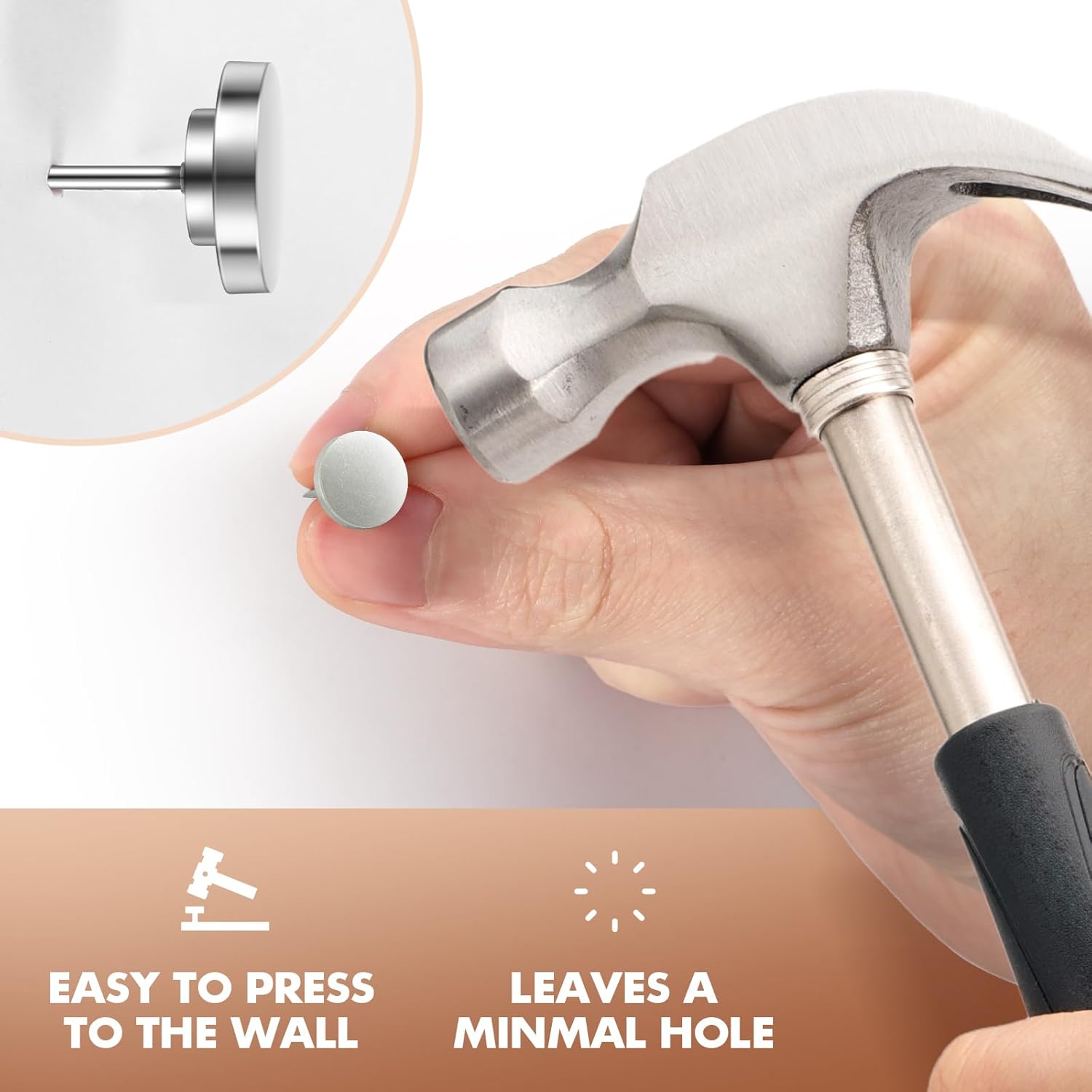 - 【Easy Installation】In the shape of ordinary push pins with silver color, these metal push pins are easy to install without causing damage to your walls. Simply tap them in with minimal effort using a picture hanging tool, and you're ready to showcase your favorite wall art or decorations, these metal push pins and picture hanging hooks are perfect for heavy-duty use.