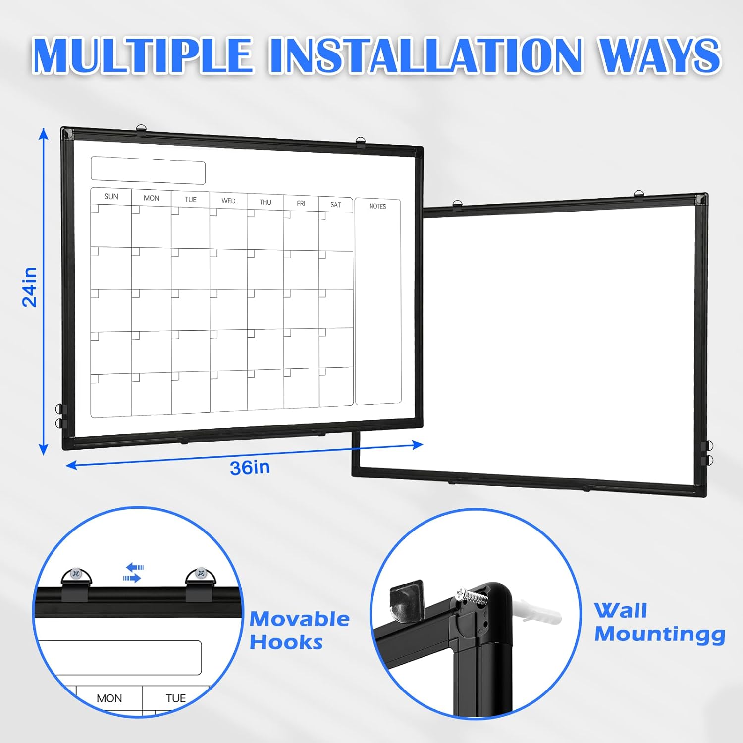 Monthly Calendar Dry Erase Whiteboard, 36" x 24" Magnetic Calendar White Board, Double-Sided Portable Board with Black Aluminium Frame for Office, Kitchen, School, Home
