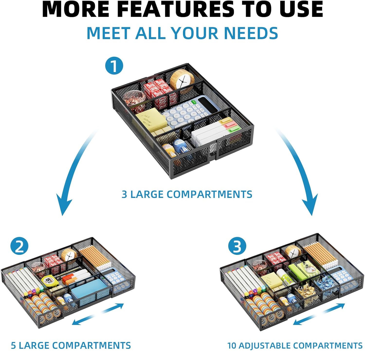 Marbrasse Expandable Desk Drawer Organizer, Mesh Drawer Organizer Tray with 10 Adjustable Compartments, Desk Organizers and Accessories, 5 Dividers Drawer for Office Supplies, Makeup & Vanity (Black)