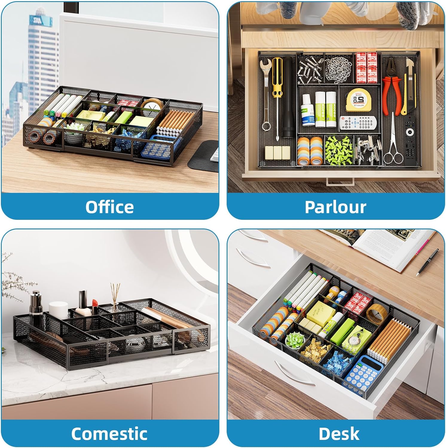 - 【Wide Application】: Not only perfect for storing office supplies and many other desk widgets but also great for storing your tools, makeup, jewelry, flatware, silverware. The well-organized drawer tray brings comfort to find what you need! and You can put any other daily necessities on the organizer, It helps you keep your stuff organized