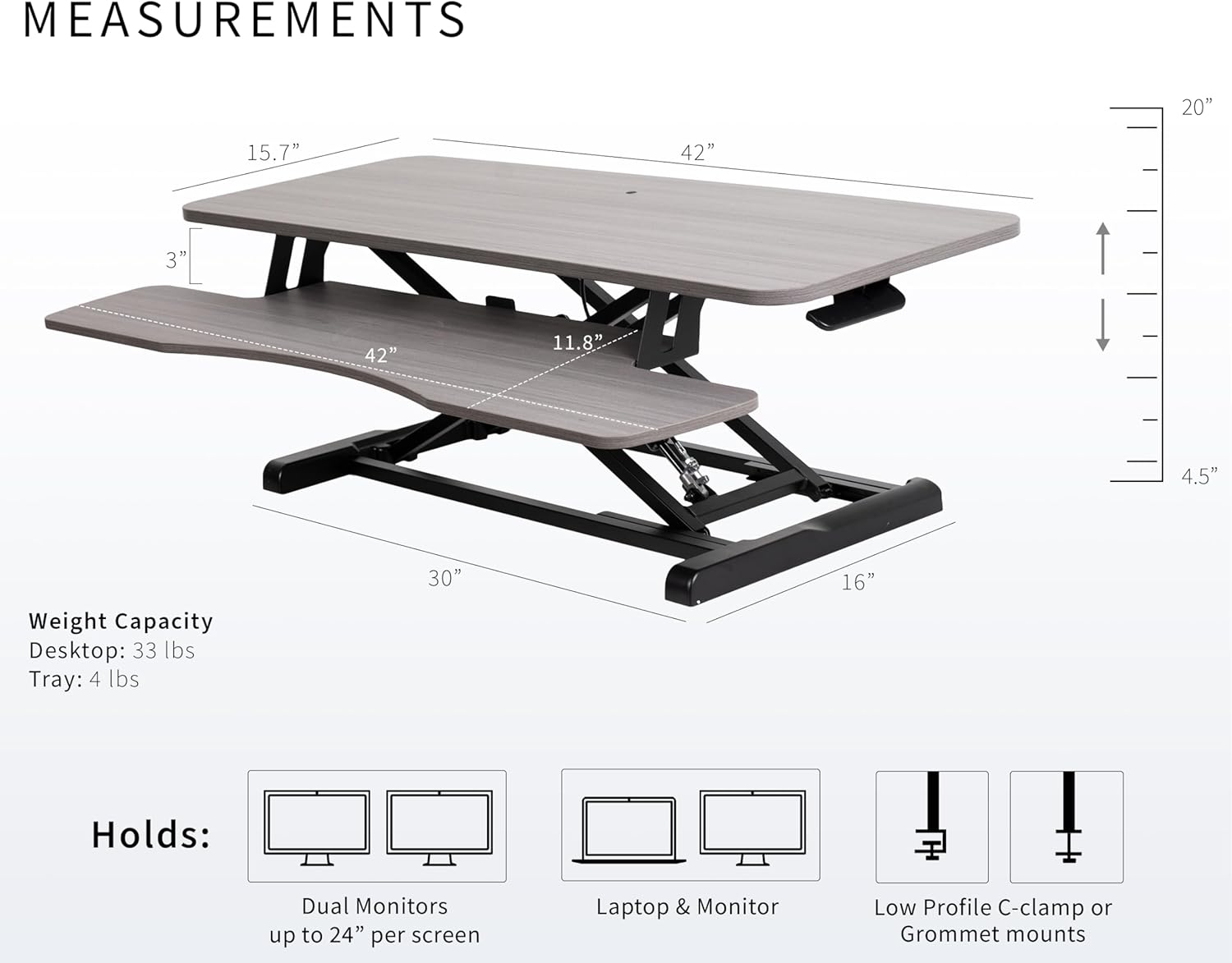 - Space Efficient 42" Surface: The top surface measures 42” x 15.7”, which provides plenty of room for dual monitors. The 42” x 11.8” (10.2” in center) keyboard tray raises in sync with the top surface to create a comfortable workstation