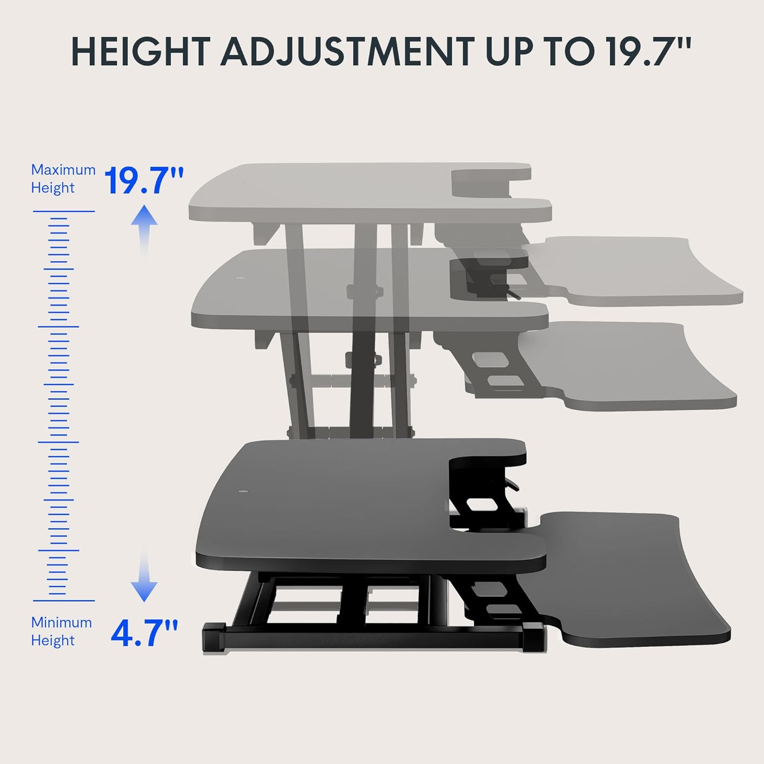 - Spring-Assisted Lift - Lift and lower your computer workstation safely and easily with FlexiSpot converters. It's easy to raise the desk riser while reducing strain on your back with the stability bar, spring-assisted lifting mechanism and up-and-out motion that ensure balance across all height settings between 4.7'' to 19.7'' .