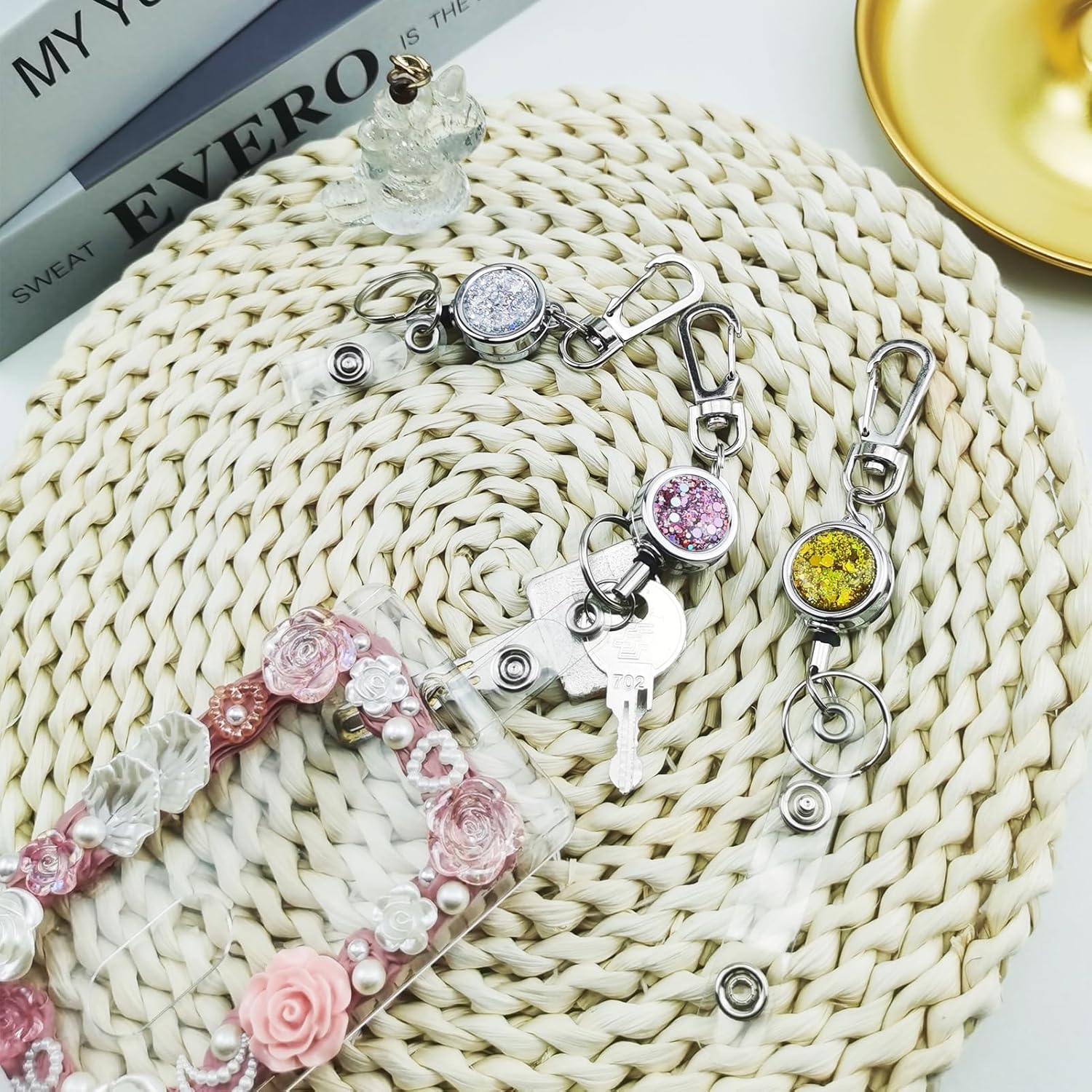 bolimoss 3 Pack Retractable ID Badge Reels with Glittery Shiny Design, Key Ring and Belt Clip,Sturdy Retractable Rope for Office Workers, Nurses, Teachers, Students (Golden, Pink, Silver)