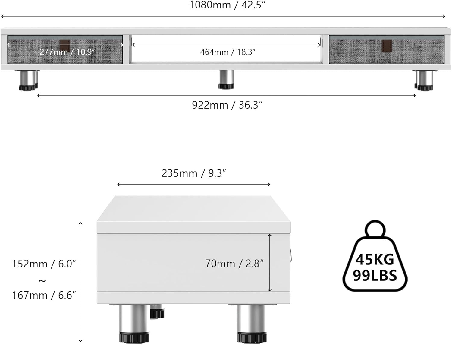 - Monitor Stand with 2 Drawers: Dual monitor stand includes a large 10.9 inch practical slide-out drawer, providing a private space for storing your desktop items, making the space neater and more spacious.