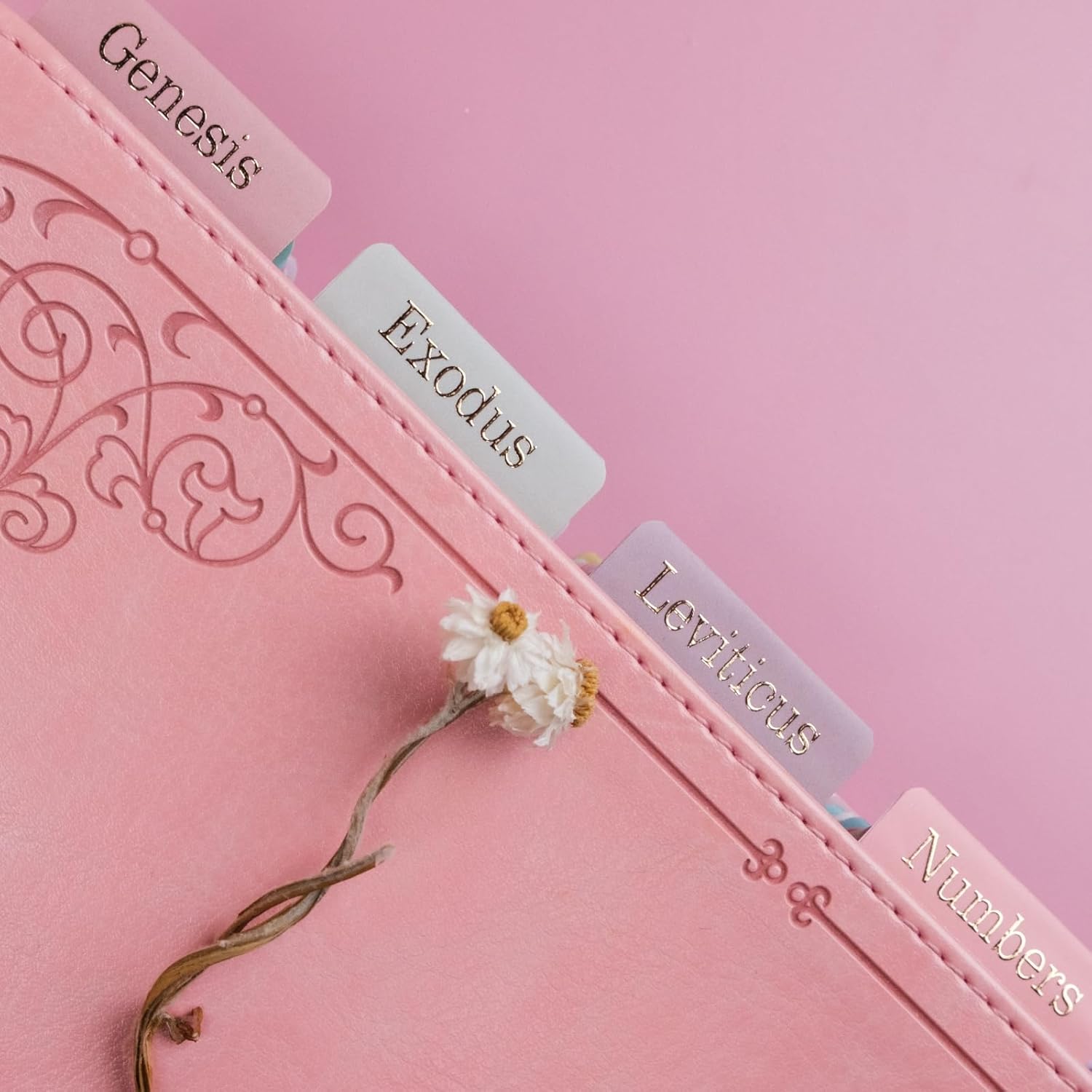 - Large Print, Easy to Read & Easy to Install: Silky velvet touch laminate,carefully designed pretty Bible accessories . The peel-and-stick Bible index tabs are self adhesive, simply align them with the provided guide or place them creatively.