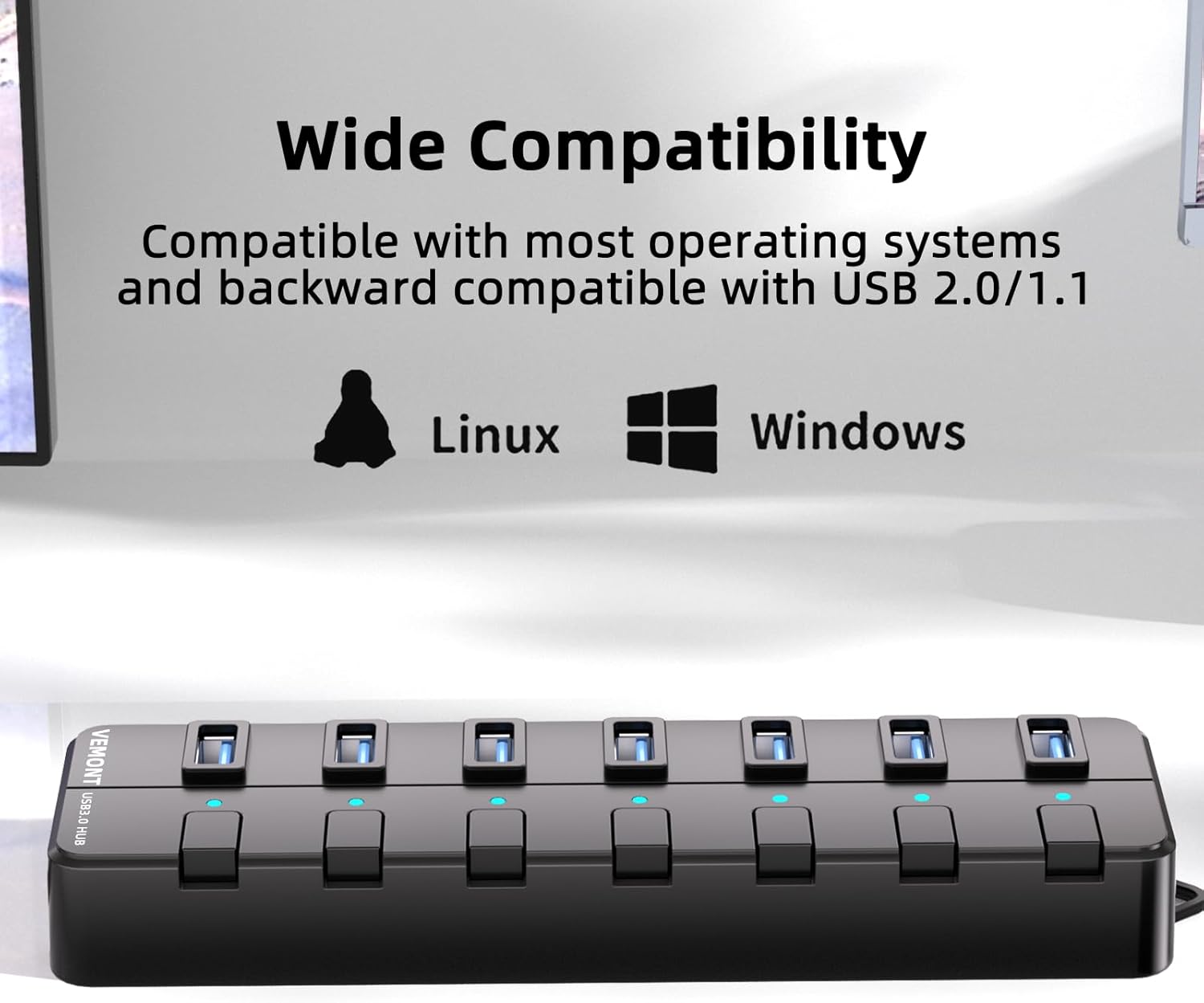 VEMONT 7-Port USB 3.0 Hub (Equipped with a 4-Foot Data Cable, Individual Switch, and Indicator Light, it Supports Data Transfer speeds of up to 5Gbps) Suitable for Desktop Computers and laptops.