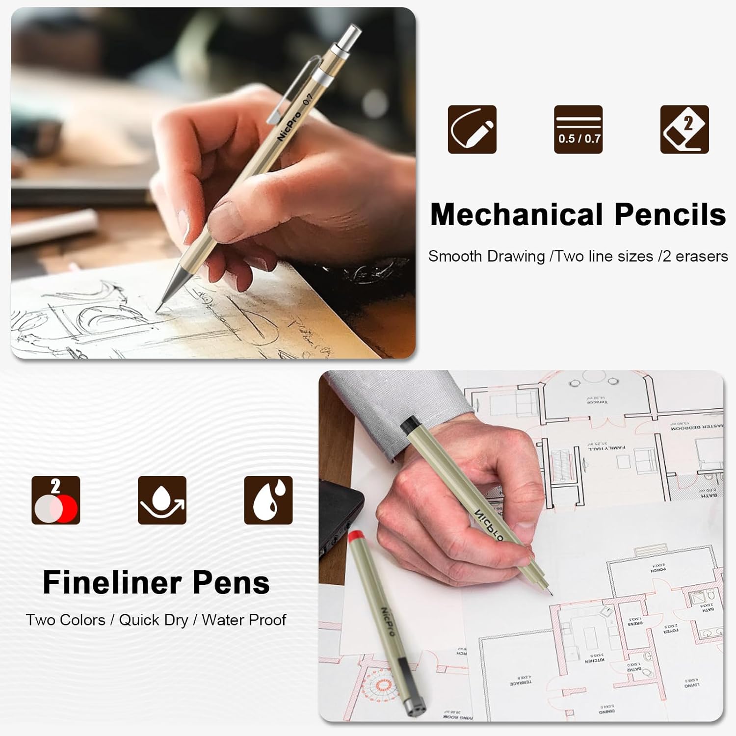- Pens and Pencils - metal mechanical pencils in two line sizes: 0.7mm pencil is suitable for daily writing and sketching, while 0.5mm is perfect for intricate details and precise work. It also comes with 2 fineliner pens in black and red color, which is quick dry and waterproof
