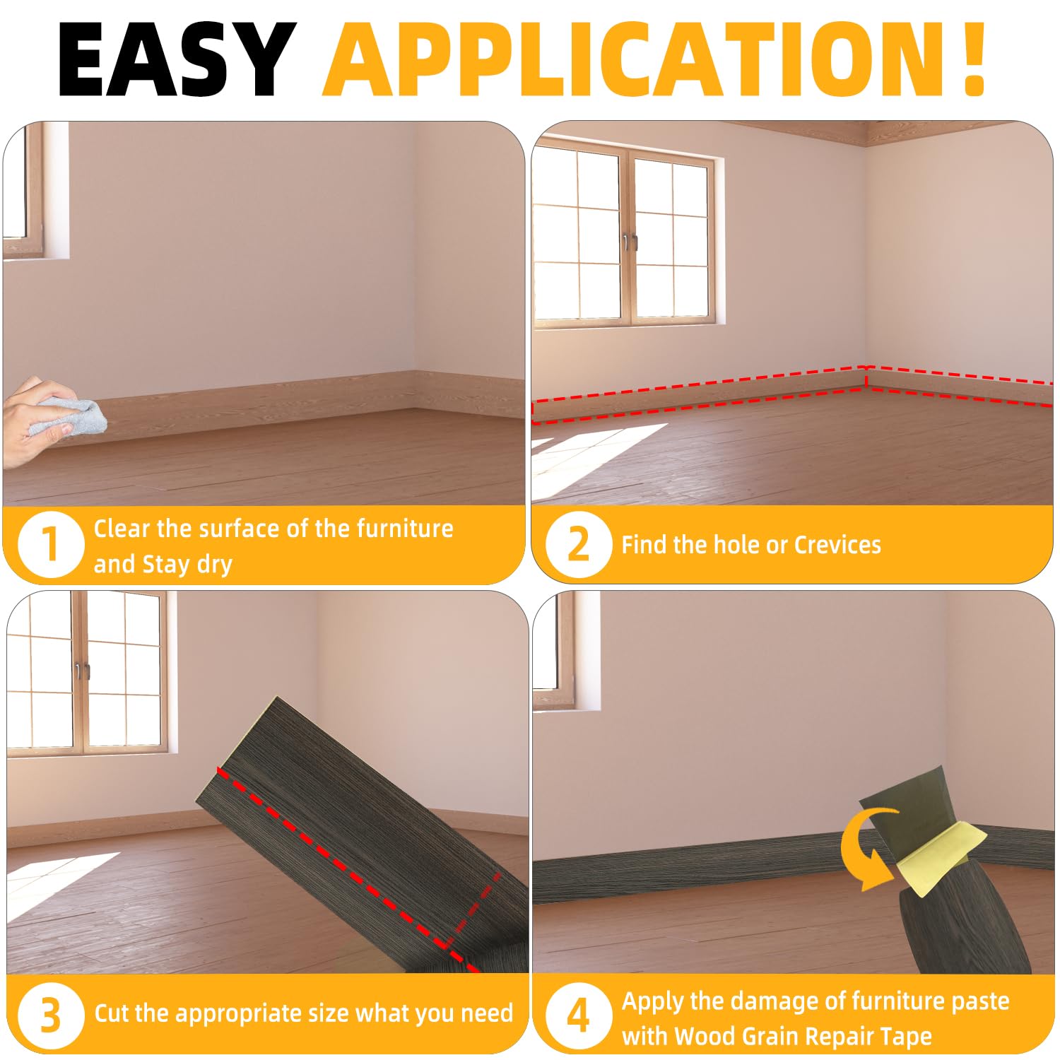 - High Quality - The Wood Grain Repair Tape is made of high quality Self Adhesive, which is durable and elastic, with a smooth surface and not easy to be dirty.When you repair Tables, Chairs, Baseboards, Doors, Windows, Floors, All Kinds of Furniture Renovation, Wood Grain Repair Tape will be your first choice