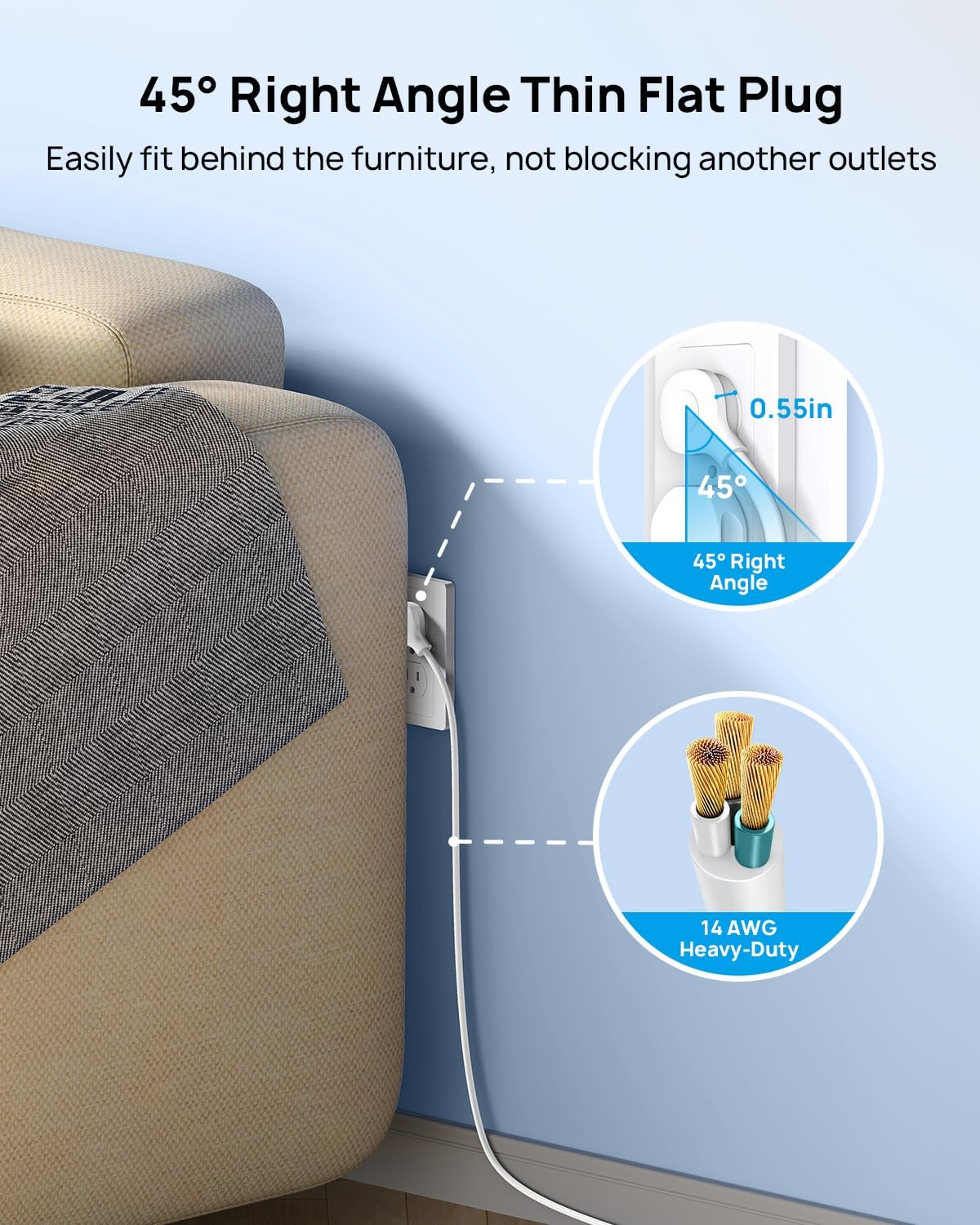 - 【Flat Plug Power Strip】Our heavy-duty power strip with a 0.55in low profile flat plug easily fits behind furniture close to the wall, and the 45° angle flat plug won't block the bottom outlet, so you can make full use of wall plugs in your home. The 5ft extension cord is made of 14AWG pure copper wire, providing more current carrying capacity (15A)