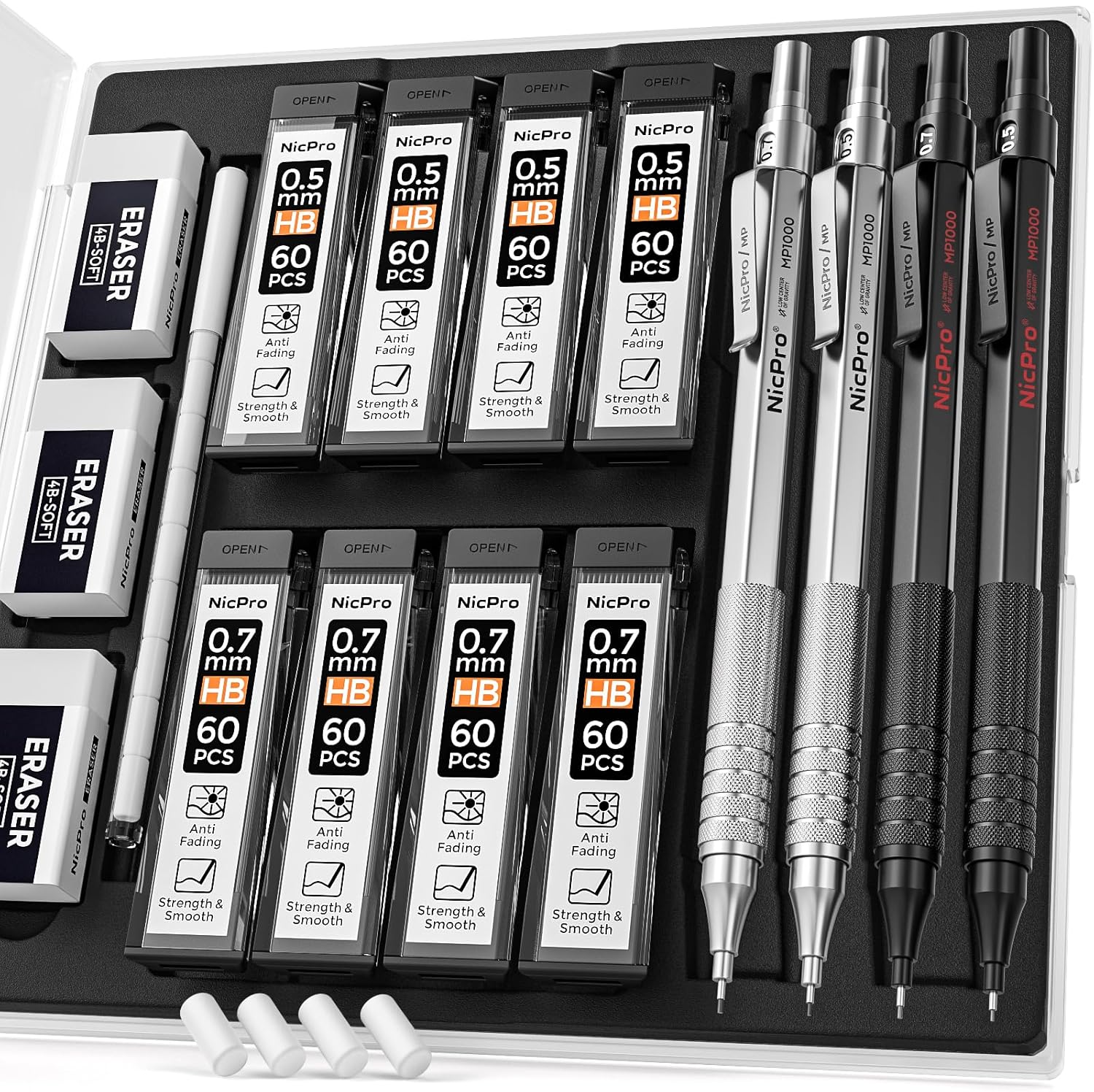 Nicpro 4 Pack Metal Mechanical Pencil Set 0.5 mm & 0.7mm with Case, Artist Pencil MP1000 with 8 Tubes HB & 2B Lead Refill, 3 Eraser, 9 Eraser Refill For Art Writing Drafting Drawing,Black & Silver