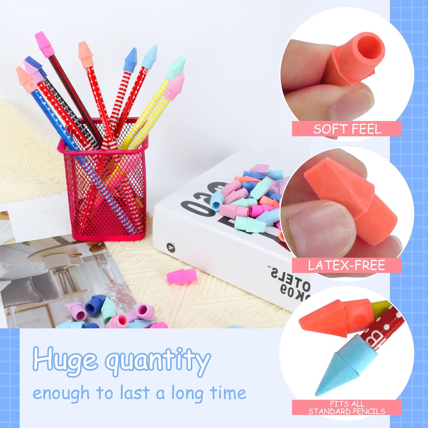 - Material: Latex-free pencil erasers toppers, erases cleanly and reduces smudging,Fits All Standard Pencils nicely and stays in place.The eraser tops for pencils have a chisel tip to enable erasure of small areas without smearing. You can also bring more tip eraser surface into contact with the paper as needed.