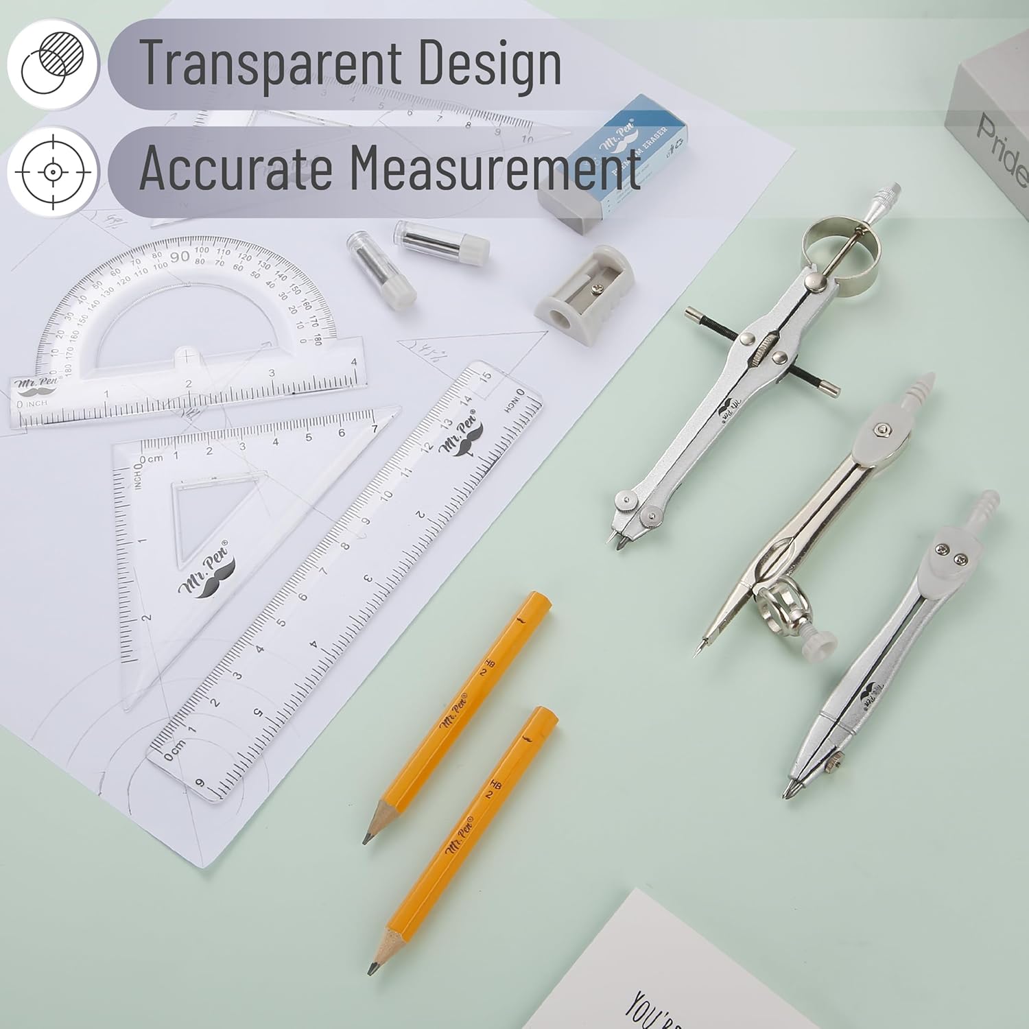 - Mr. Pen geometry set contains 13 pieces, including three metal compasses with spare leads, a 6-inch ruler, two triangles (45° and 30°/60°), a 4-inch protractor, two pencils, a pencil sharpener, an eraser, and lead refills—all encased in a sturdy storage container.