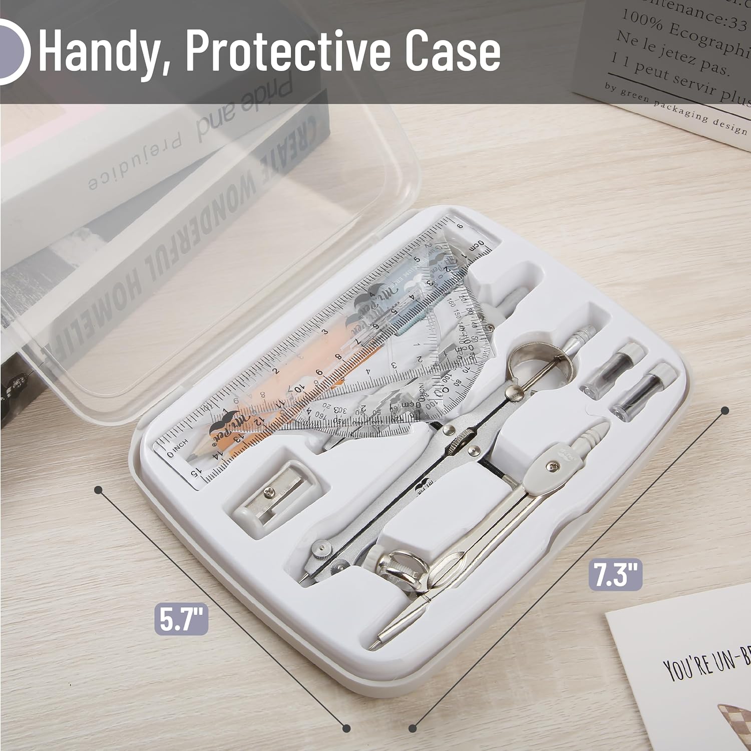 - The set features a precision compass with a lockable slide for accurate circle drawing and a spare lead for uninterrupted work.