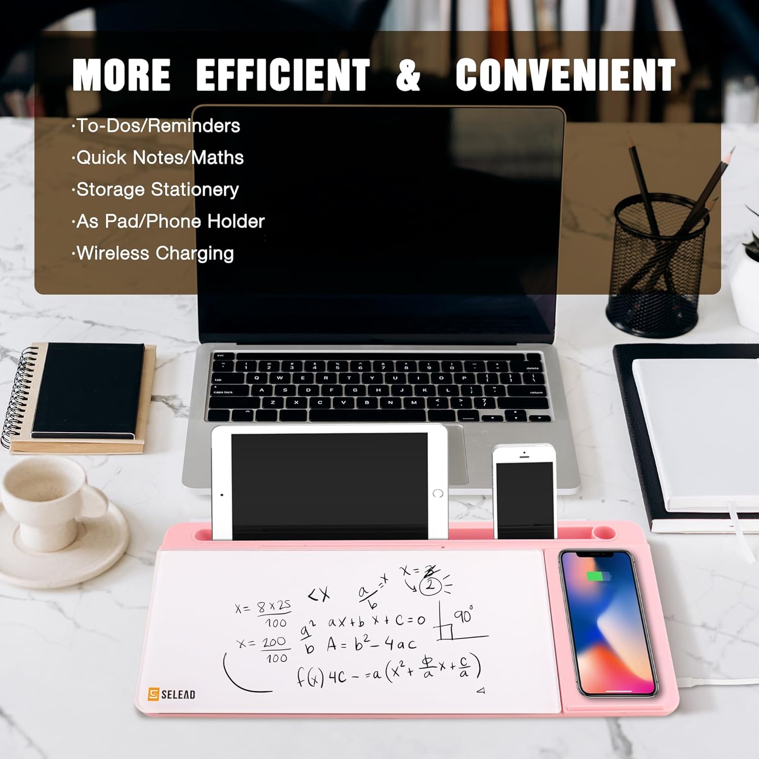 SELEAD Desktop Glass Whiteboard with Wireless Charger Station and Mirror, Desk Dry Erase Board Computer Pad Keyboard Stand with Organizer for Home, School, Office Accessories for Women, Pink