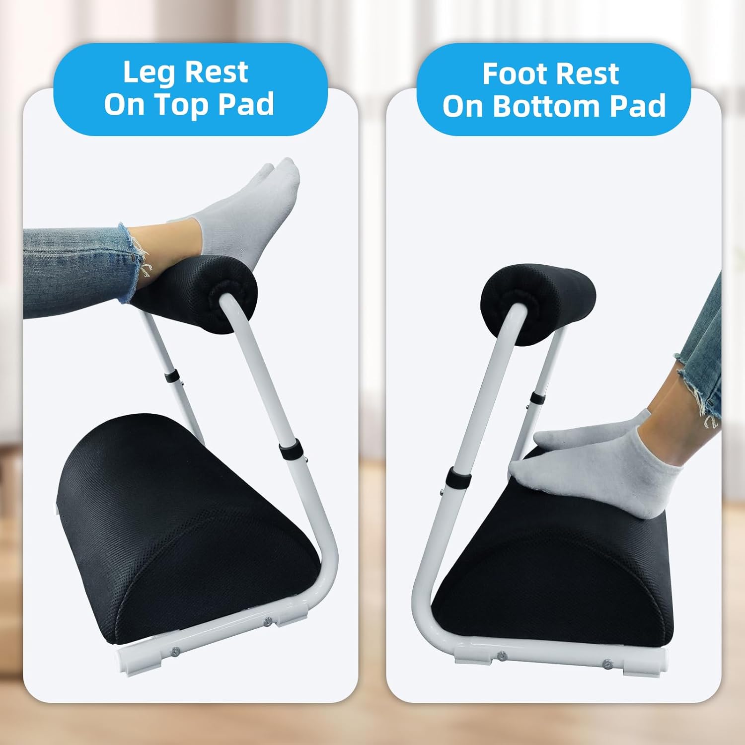 - Two-cushion Design for Flexible Comfort: This under-desk footrest features a detachable two-cushion system: an upper leg rest (15.5 × 3.5 × 3.5 in) that reduces sitting fatigue, and a wide footrest (15.8 × 11.4 × 5.5 in) for stable support. Use them together or detach the lower cushion to use it alone as a leg extension pad.