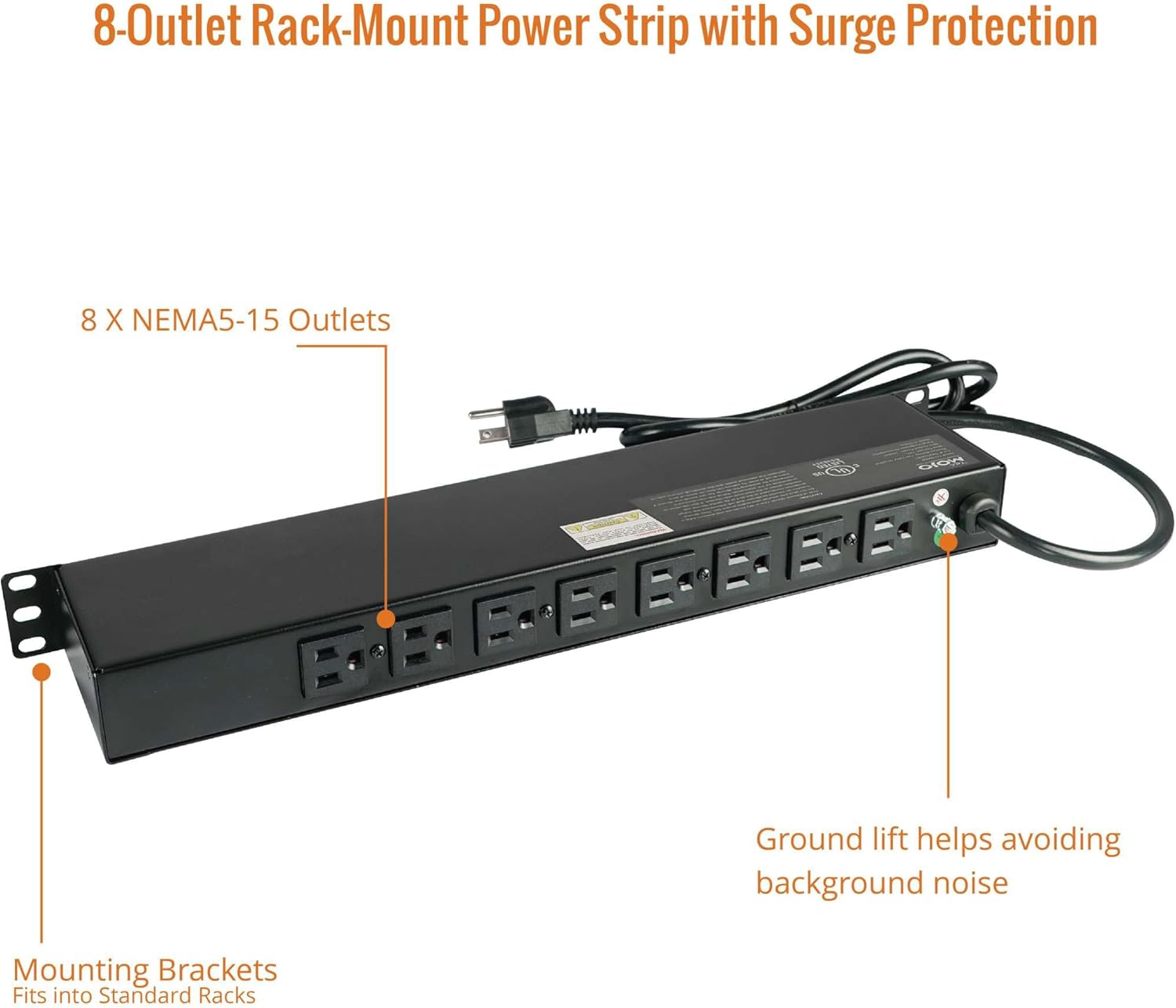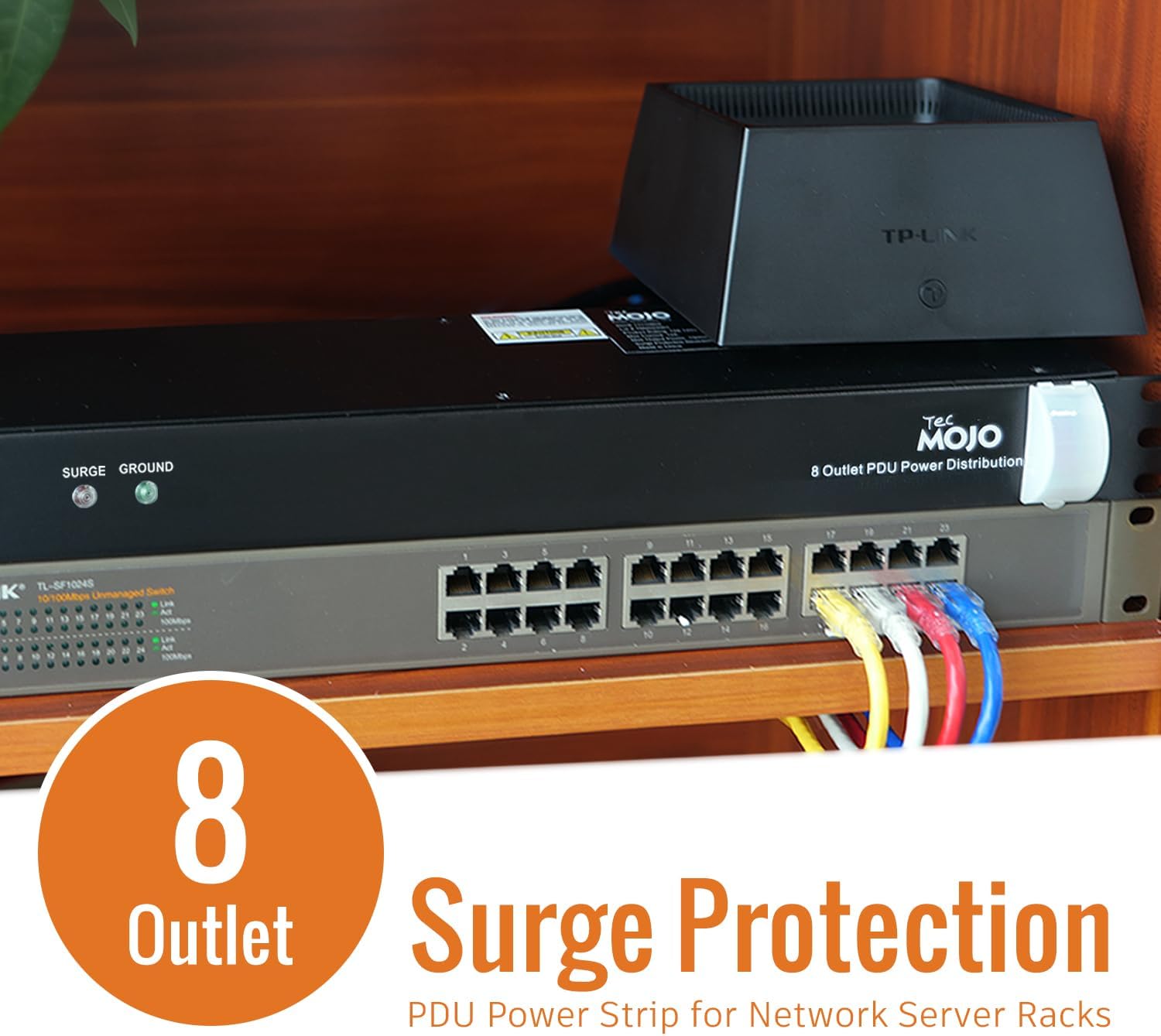Tecmojo 1U Rack-Mount Horizontal 8-Outlet Power Strip UL Listed PDU with Surge Protection 6ft Cord Power Distribution for IT and Network Server Racks