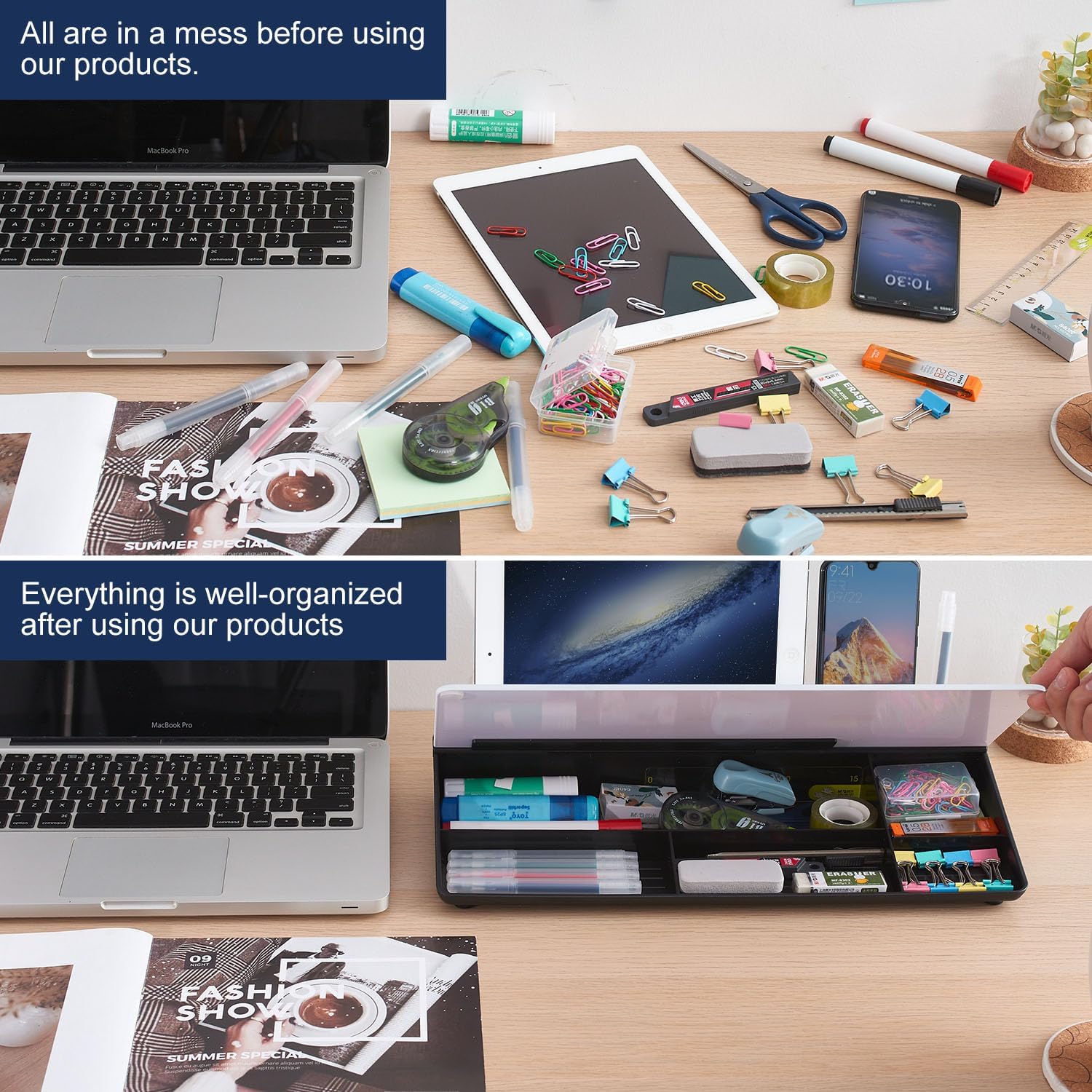 - HIDDEN STORAGE & PAD/MOBILE TRAY: De-clutter your desk by storing markers, magnetic eraser and other desktop accessories in the opening drawer or place markers on the accessory tray for quick access. And one more long tray on the top of the dry erase white board for your pad or mobile.