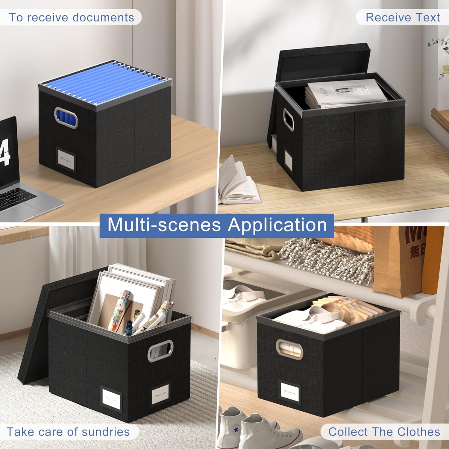 File Organizer Box - File Boxes for Hanging Files with Lid Set of 2 Decorative Hanging Folders Letter Size Organizer with One-Piece Plastic Frame Slides (Black, 13.2 * 10.1 * 10.1in(2Pack))
