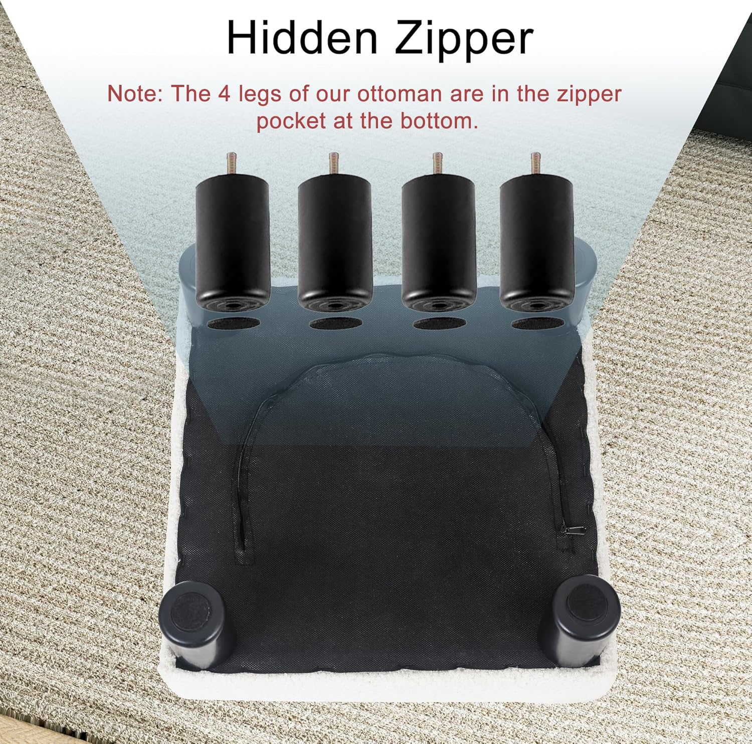 - EASY TO INSTALL: You need to install 4 plastic legs by yourself, It is simple, just need to screw the 4 legs of the stool; Note: The 4 legs of our ottoman are in the zipper pocket at the bottom. Ideal for the living room, guest room, bedroom, home station, office, entryway an so on.