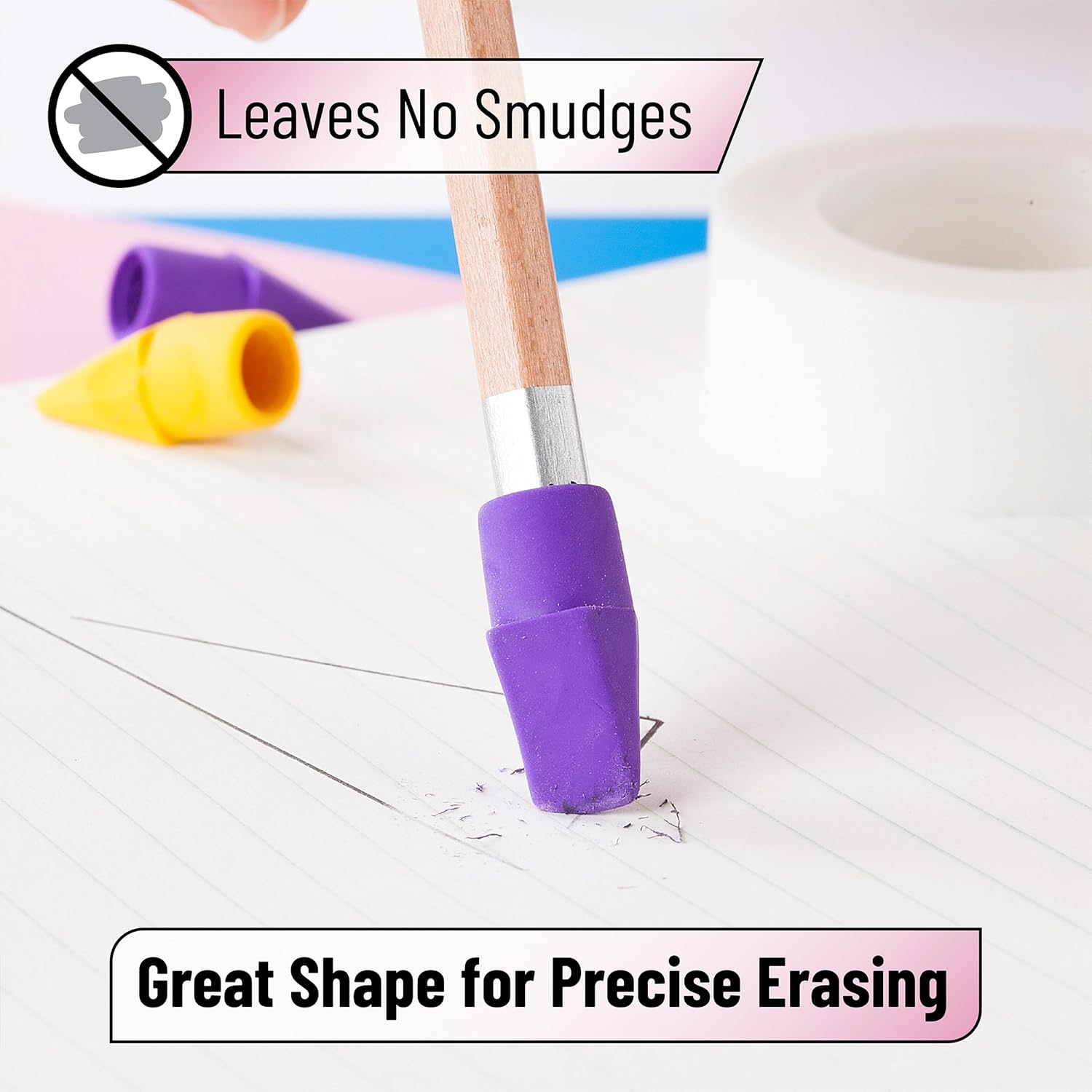 - You can use pencil top erasers on most surfaces without smudging, and they clean easily without scratching, tearing, or damaging paper. Perfect for exams, essays, and everyday writing.