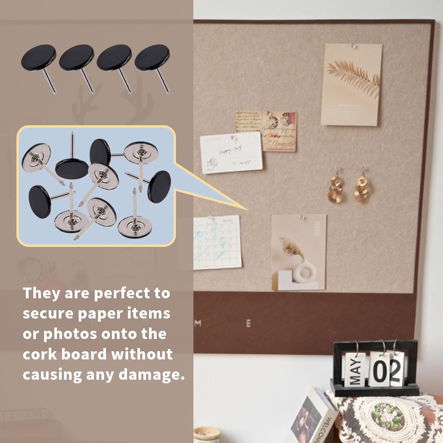 - QUALITY SERVICE: The upholstery tack is ideal for attaching paper items or photos to the cork board. If you have any questions about flat head thumb tacks, please feel free to contact us and we will try our best to help you