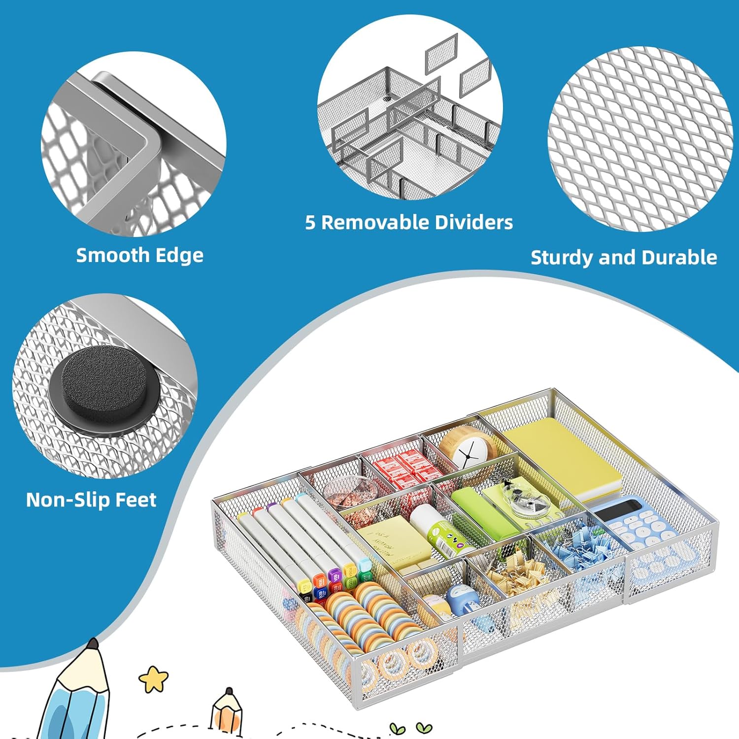 Marbrasse Expandable Desk Drawer Organizer, Mesh Tray with 10 Adjustable Compartments, Desk Organizers for Office Supplies, Makeup & Vanity (Expandable-Silver)