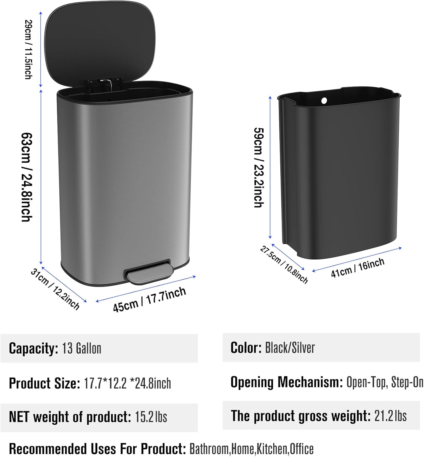 - BEST PROFESSIONAL TRASH CAN SUPPLIER: You will love this high quality 13-gallon stainless steel foot pedal trash can. In the process of use, please do not hesitate to contact us immediately if any problem occurs. We have a well trained customers service team, which could reply you in short time and give you help, aim to give a better shopping experience to our customers. Please rest assured to buy!