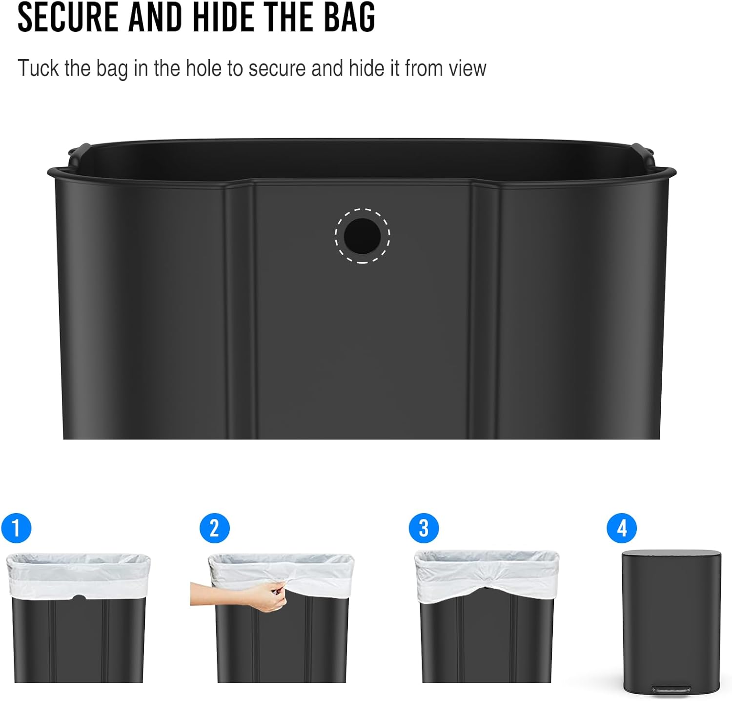 - LARGE CAPACITY TRASH CAN: 12.2''L×17.7''W×24.8''H, 13.2 gallon(Please Note: Due to the curved angle edges of the box, manual measurements may have a slight error, and the actual size may be slightly larger). The huge capacity definitely meets your daily use, this can fits most brands of 13 gallon trash bags. It can be a good helper for your kitchen & make your room clean and tidy. The sophisticated oval appearance also makes it suitable for a variety of occasions.