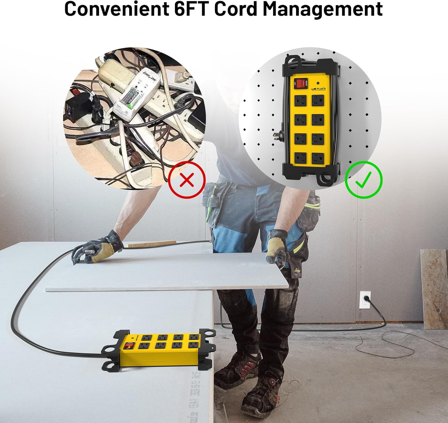 Plug'n 8 Outlet Heavy Duty Power Strip,Wide Spacing,Workshop Surge Protector 2700J with 6FT Extension Cord,Industrial Metal Power Strip 15Amp,Yellow Wall Mount Power for Garage,Office