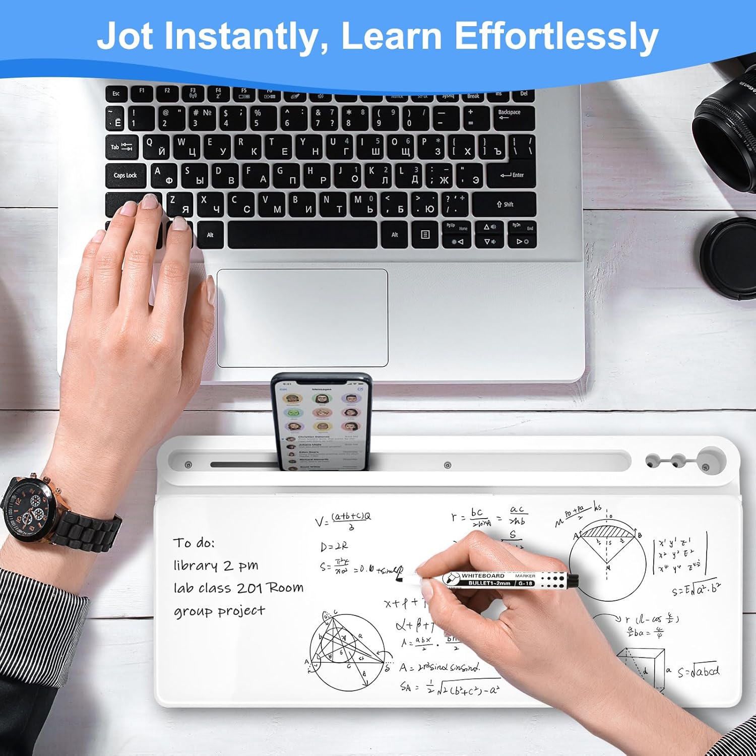 - Multiple Functions - To enhance the overall convenience of the product, this whiteboard includes 1 large pen holder, 2 small pen holders and 1 slot on the top which can hold 3 markers, a tablet and a phone. Equipped with charging port notch in the slot, the desk board is a good option to realize office charging, and you can charge your phone quickly. This dry erase board is more ergonomic with the perfect ramp design and non-slip design, which can make itself be used as keyboard pad.