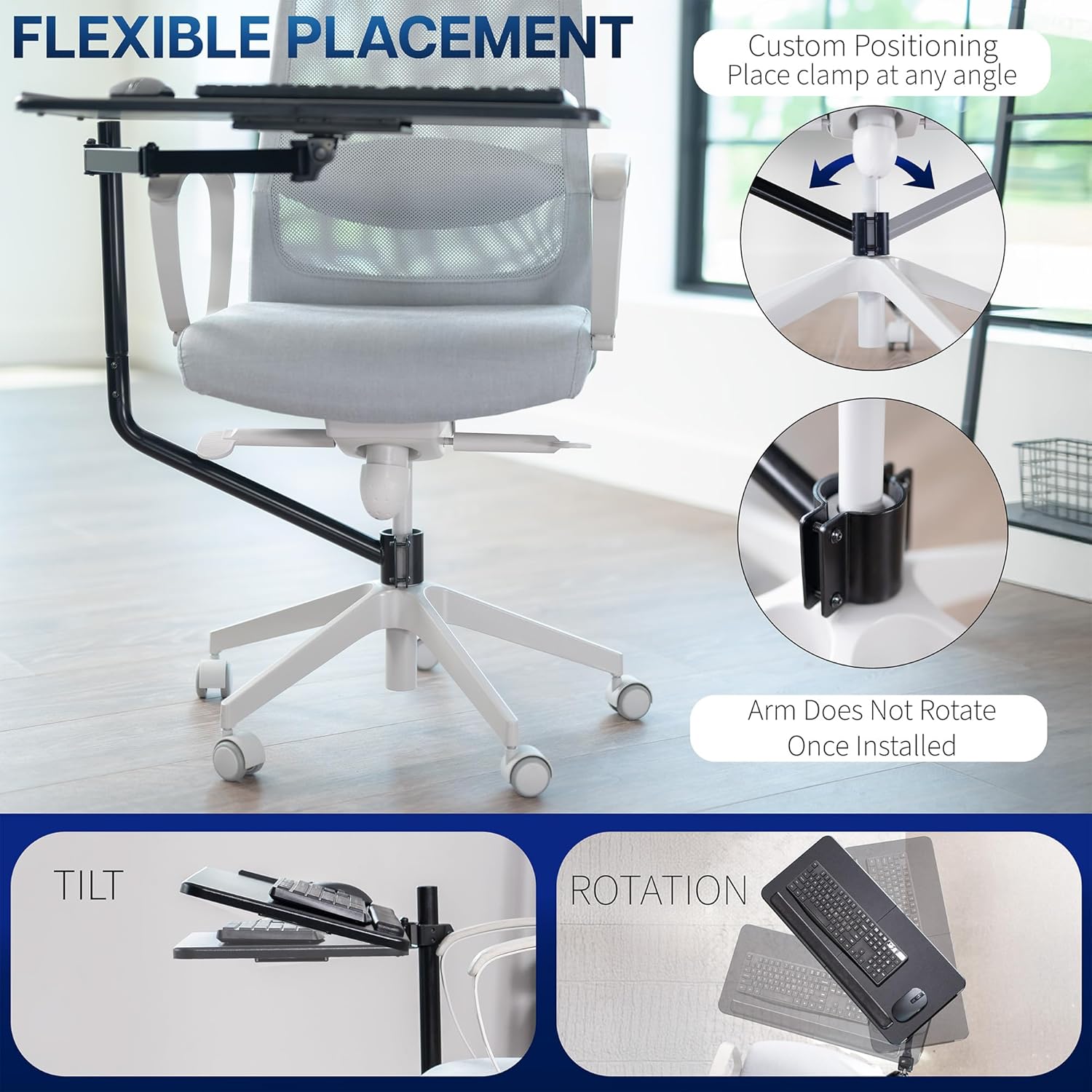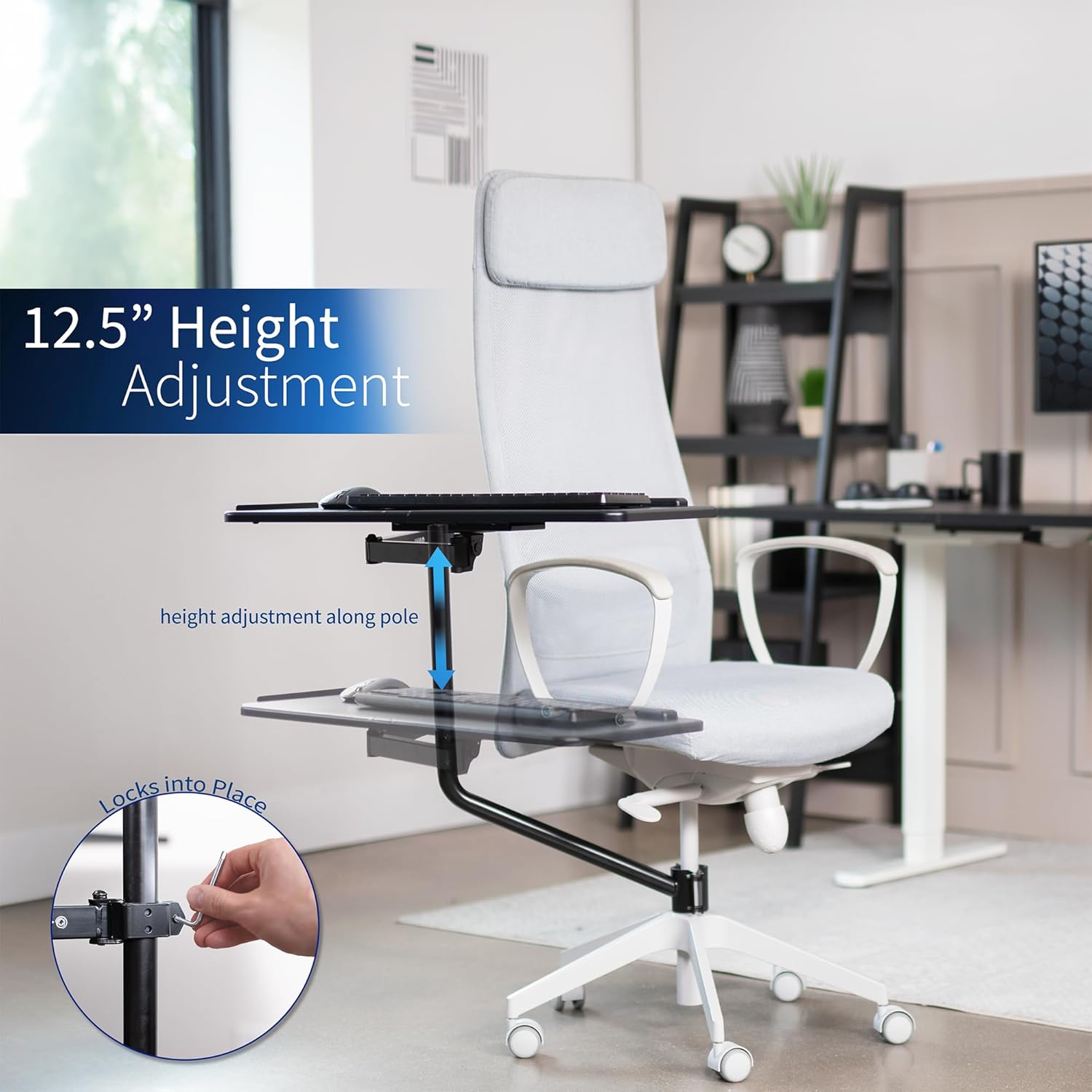 - Over Chair Keyboard Tray: Steel arm support attaches to the bottom tube section (1.7” to 2” in diameter) of a standard height adjustable office chair for ergonomic typing angles and customized placement --Patent Pending--