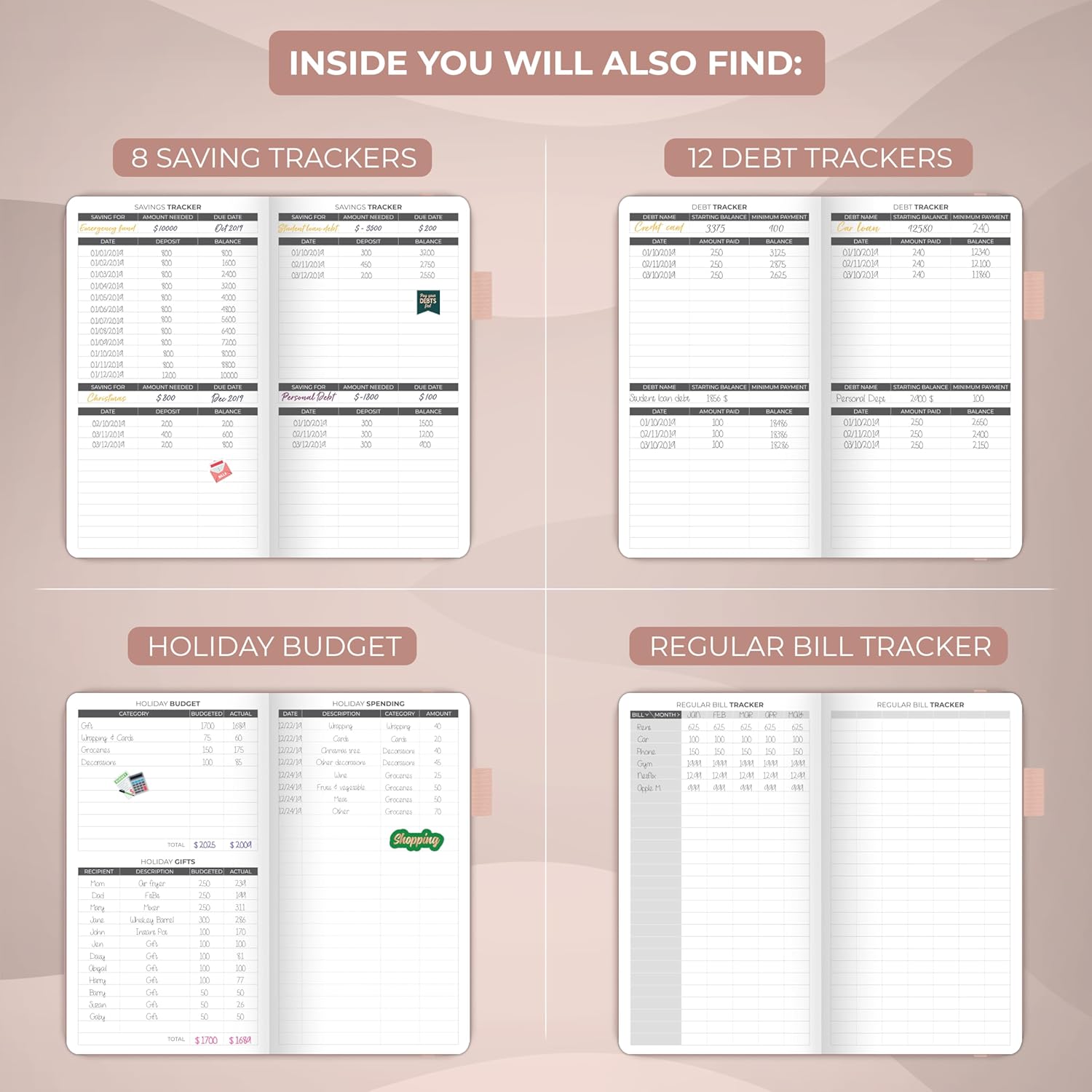 - Effortlessly Manage Spending, Debts, and Savings – This 12-month finance planner features an undated format with monthly calendars, budget plans, expense trackers, 8 savings and 12 debt trackers.