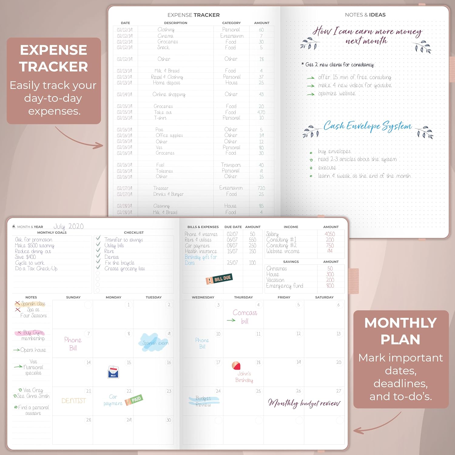 - Effortlessly Manage Spending, Debts, and Savings – This 12-month finance planner features an undated format with monthly calendars, budget plans, expense trackers, 8 savings and 12 debt trackers.