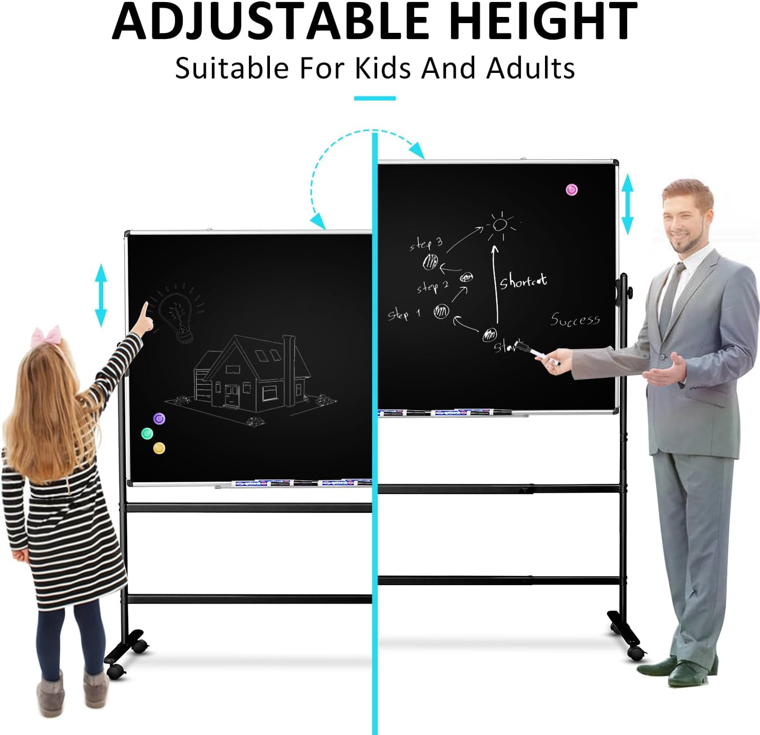 - 【360° ROTATION & HEIGHT ADJUSTABLE】- The whiteboard is capable of being rotated 360 degrees and locked in place at the desired angle, double-sided panels can be switched at will; the height can be adjusted also, be easily adjusted to the most comfortable height according to your needs, whether it is adults or children
