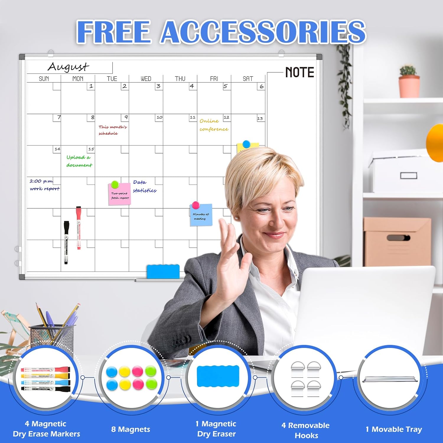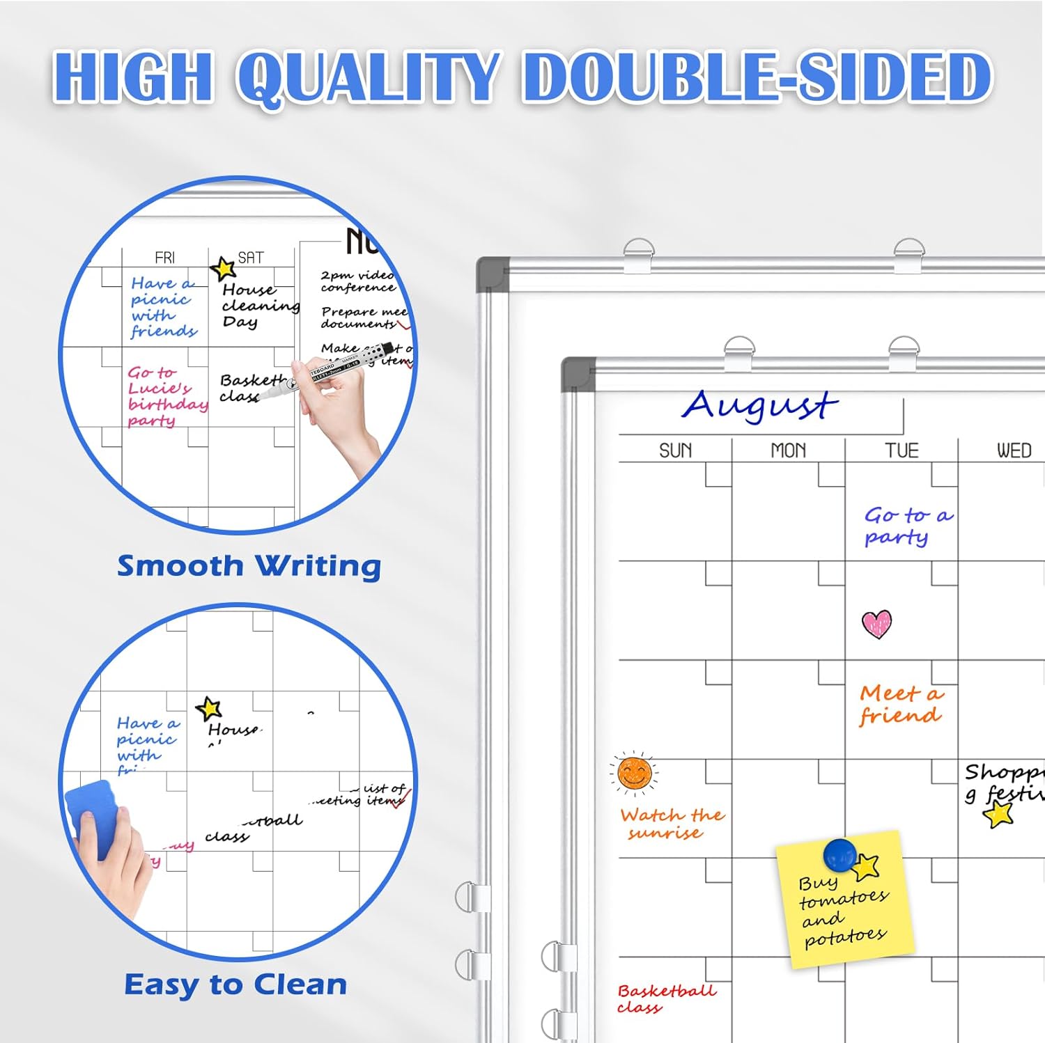 - 【Double-Sided Calendar White Board】: Our monthly whiteboard can put your life in order and plan ahead. Magnetic dry erase calendar board is perfect for pinning notes, messages, pictures, memos, calendars, menus, reminders and more. The magnetic double-sided whiteboard allows you to have two projects going. The other sided is blank. It is the best tool for home teaching or memo.
