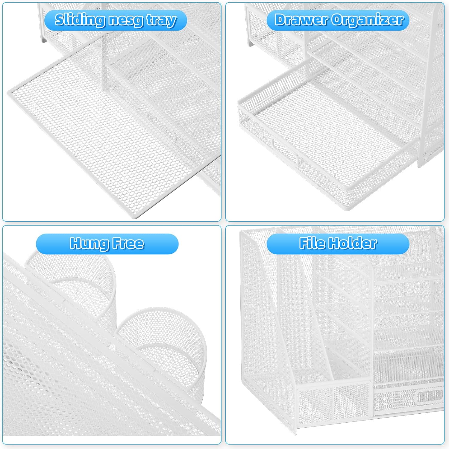 - Multiple Use: Our office organizers owns 5 sliding trays + 2 Magazine Holders + 2 Hanging Pencil Holders + 1 sliding large capacity drawer which have enough storage space to accommodate all your office supplies and keeps your desktop neat, which is very suitable for offices and schools.