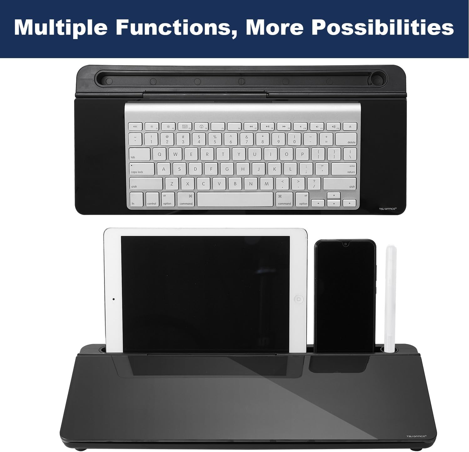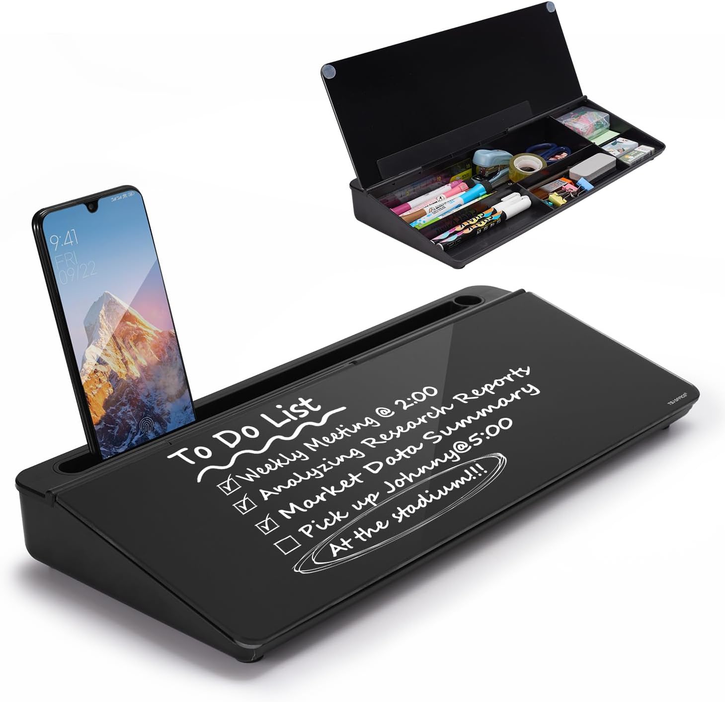 - HIDDEN STORAGE & PAD/MOBILE TRAY: De-clutter your desk by storing markers, magnetic eraser and other desktop accessories in the opening drawer or place markers on the accessory tray for quick access. And one more long tray on the top of the dry erase white board for your pad or mobile.
