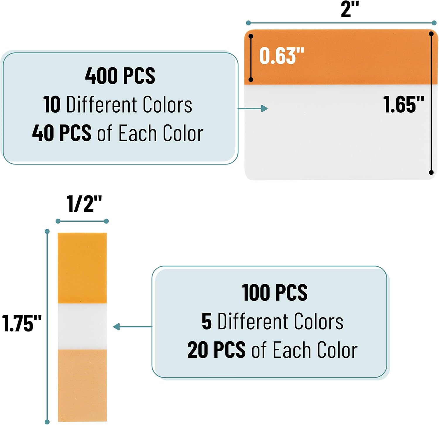 - Package includes 500 pieces of sticky tabs in 21 sets, 400 pieces of 2-inch tabs in 20 sets with 10 different colors, and 100 pieces of 0.5-inch tabs in 1 set with 20 pieces of each color.