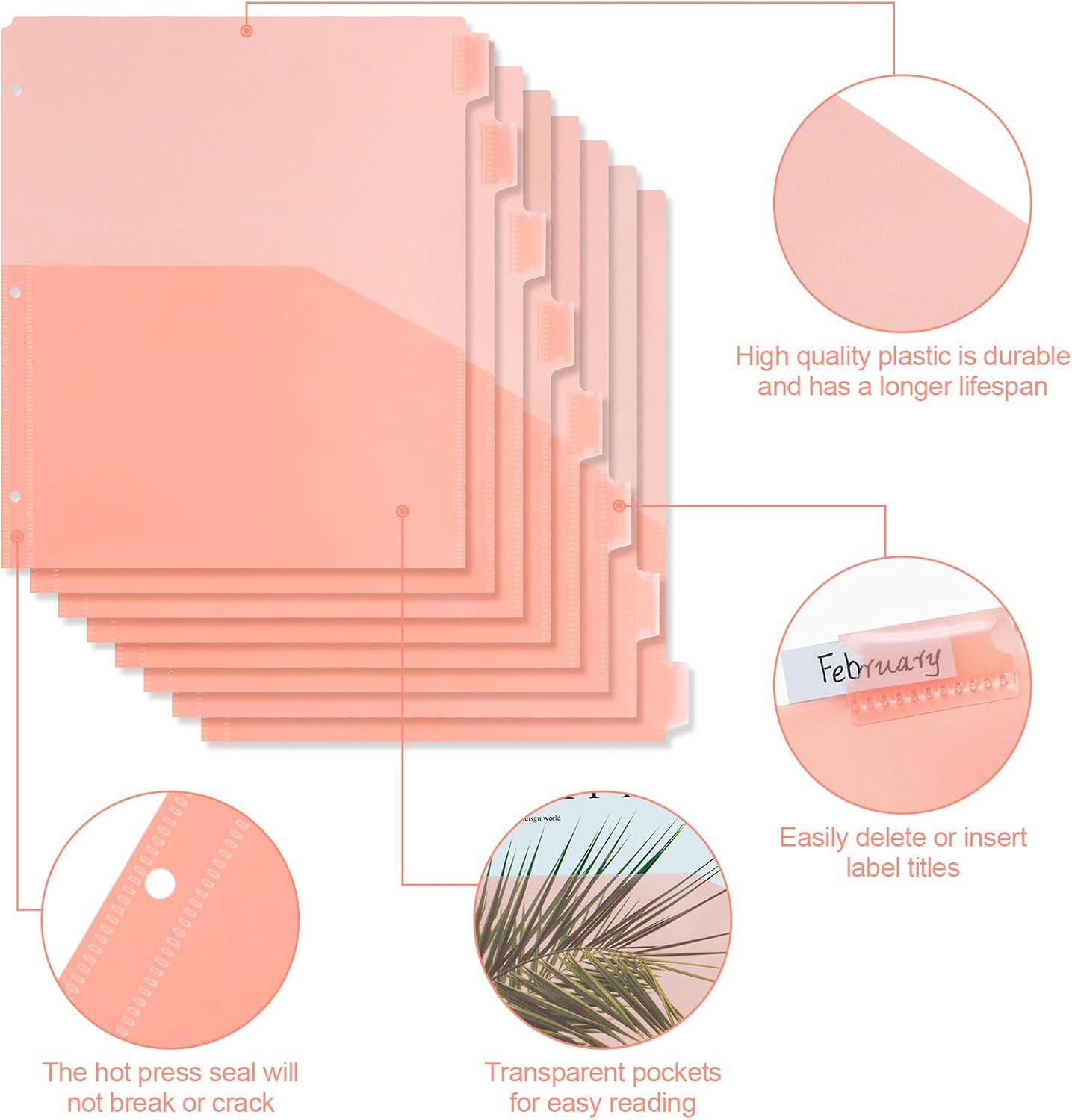 - 【Fits 3 RIng Binders】3 Holes punched, fit in 3 ring binders. Our Plastic Pocket Dividers are measured 9.8 x 11.5 inches, providing the maximum coverage for your letter-sized paper. There are a total of 8 dividers for 3 ring binder with pockets in the package.