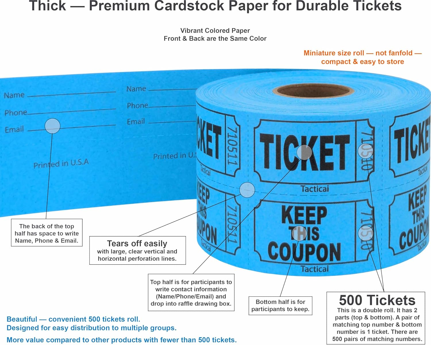 Tacticai 500 Raffle Tickets, Blue (1 of 8 Colors), Double Roll, Ticket for Events, Entry, Class Reward, Fundraiser & Prizes