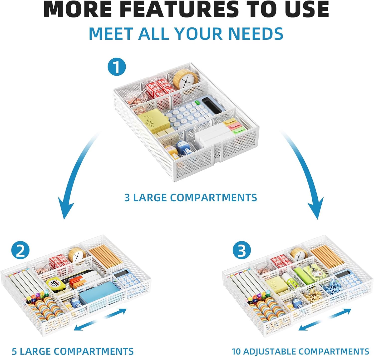 - 【Adjustable Dividers】: Our drawer organizer features 4+1 removable dividers. You would configure the size for fit varisized desk accessories, such as pens, erasers, highlighters, notes, staplers, tapes, clips