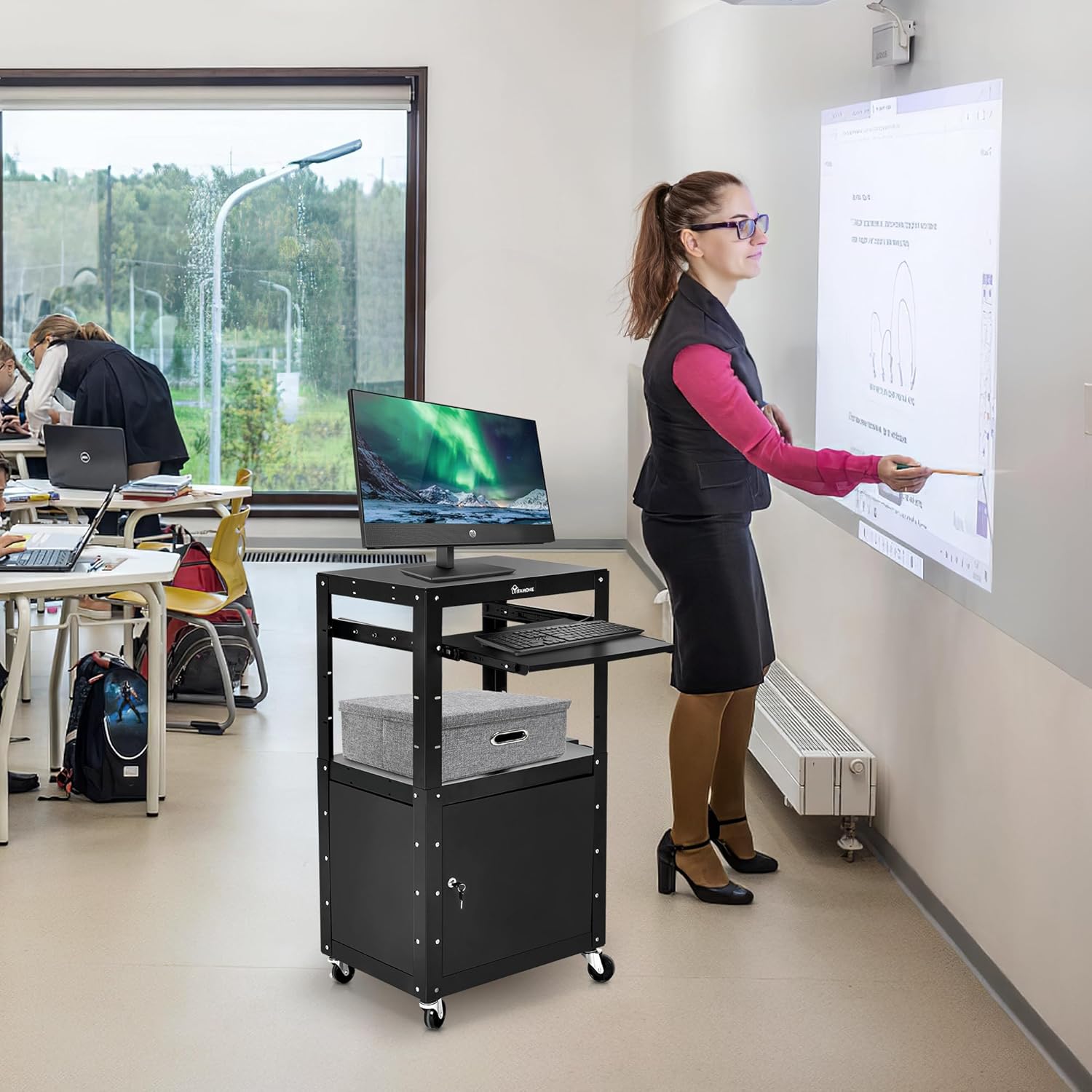 YITAHOME Steel AV Cart with Locking Cabinet, Metal Presentation Cart with Keyboard Tray, Rolling Media Cart with Wheels & Power 16.4ft Extra-Long Cord for Computer Laptop Projector Printer Black